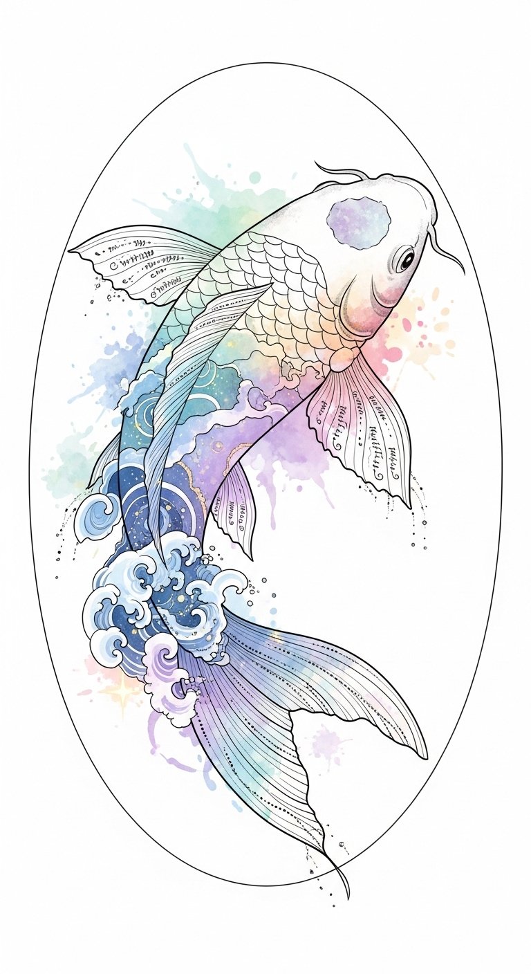 This design uses the koi-to-cosmos motif to symbolize transformation, intuition, and a deep emotional inner life; the watercolor splashes represent fluid feelings and creative expression while the constellations and gold accents tie the wearer to universal guidance and spiritual longing.