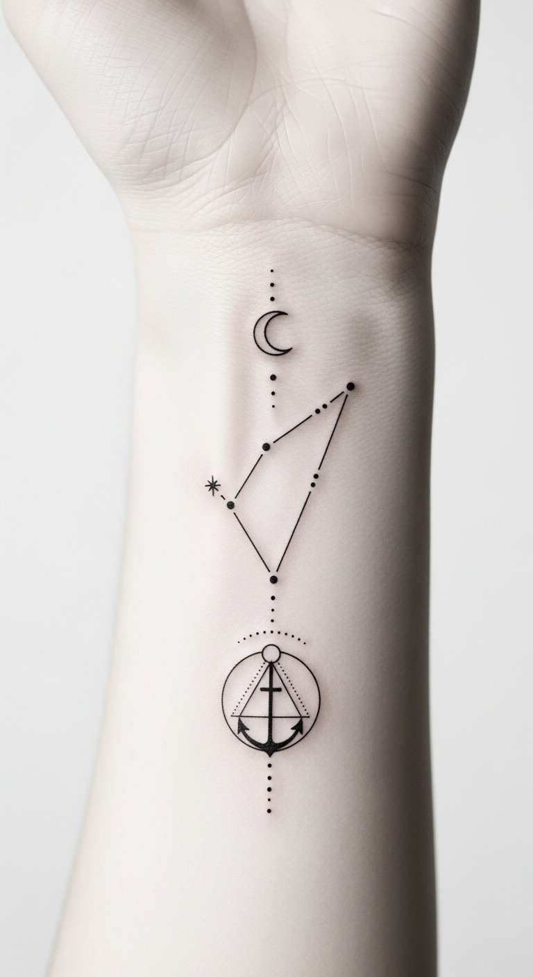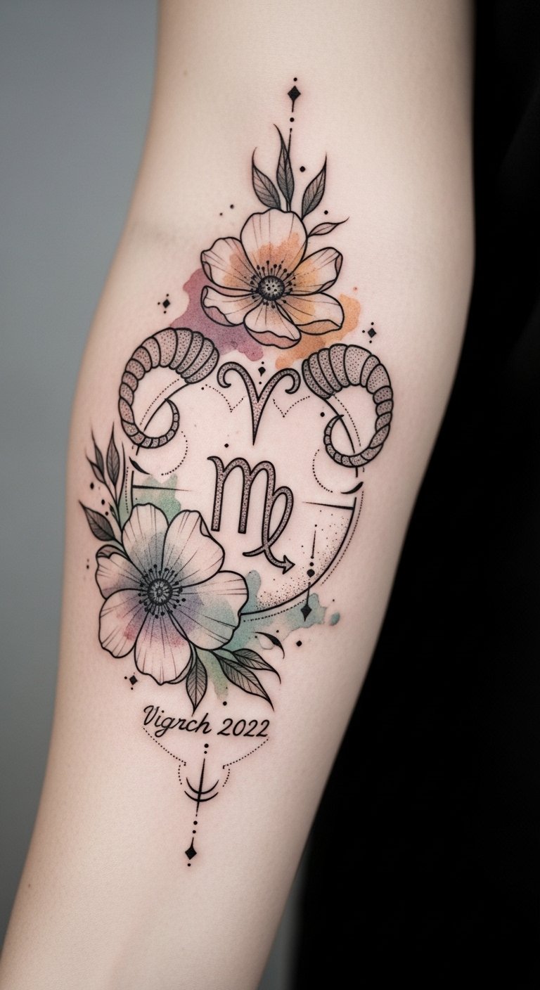 The design concept pairs the intimate clarity of a wrist or inner forearm placement with celestial symbolism: the zodiac glyph anchors identity, constellations suggest destiny’s threads, and watercolor accents convey emotion and individuality.