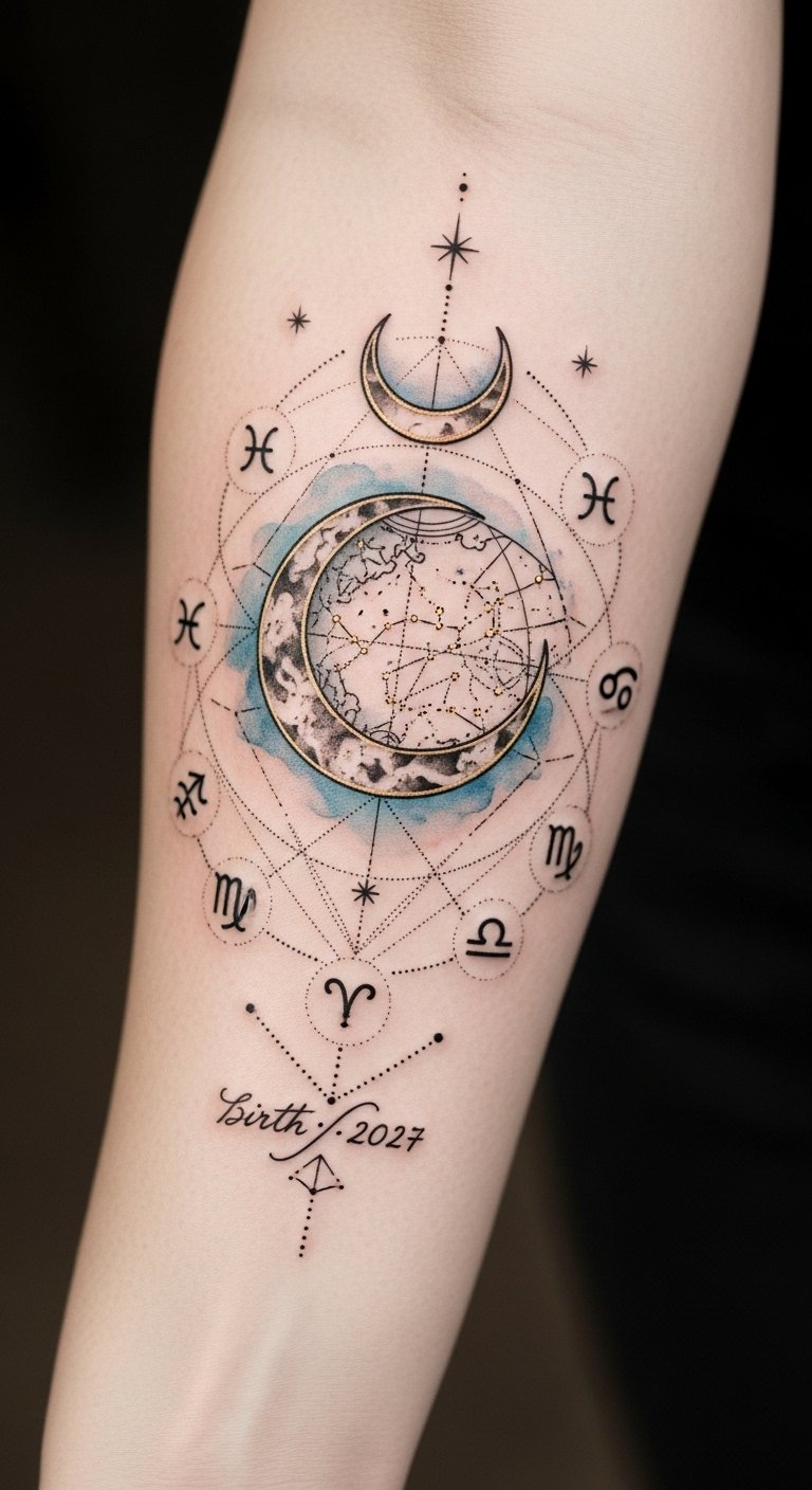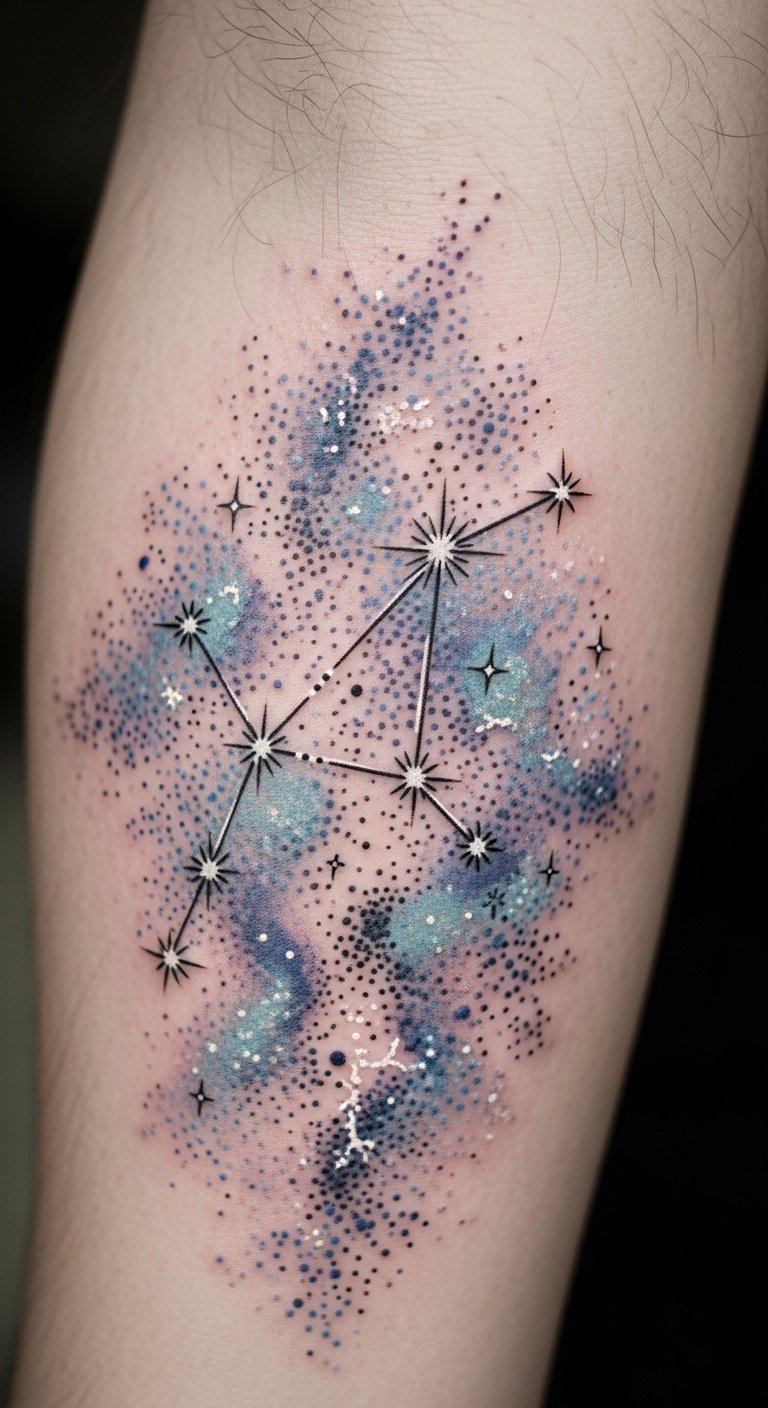 A slender forearm or upper shoulder tattoo combining fine-line constellation mapping with a minimalist zodiac glyph, accented by delicate bursts of watercolor in deep indigo and gold; intricate line work threads through simplified planetary motifs to balance modern aesthetics with timeless symbolism, evoking introspection, personal growth, and a confident connection to the cosmos while allowing the wearer’s unique journey through the stars to remain central.