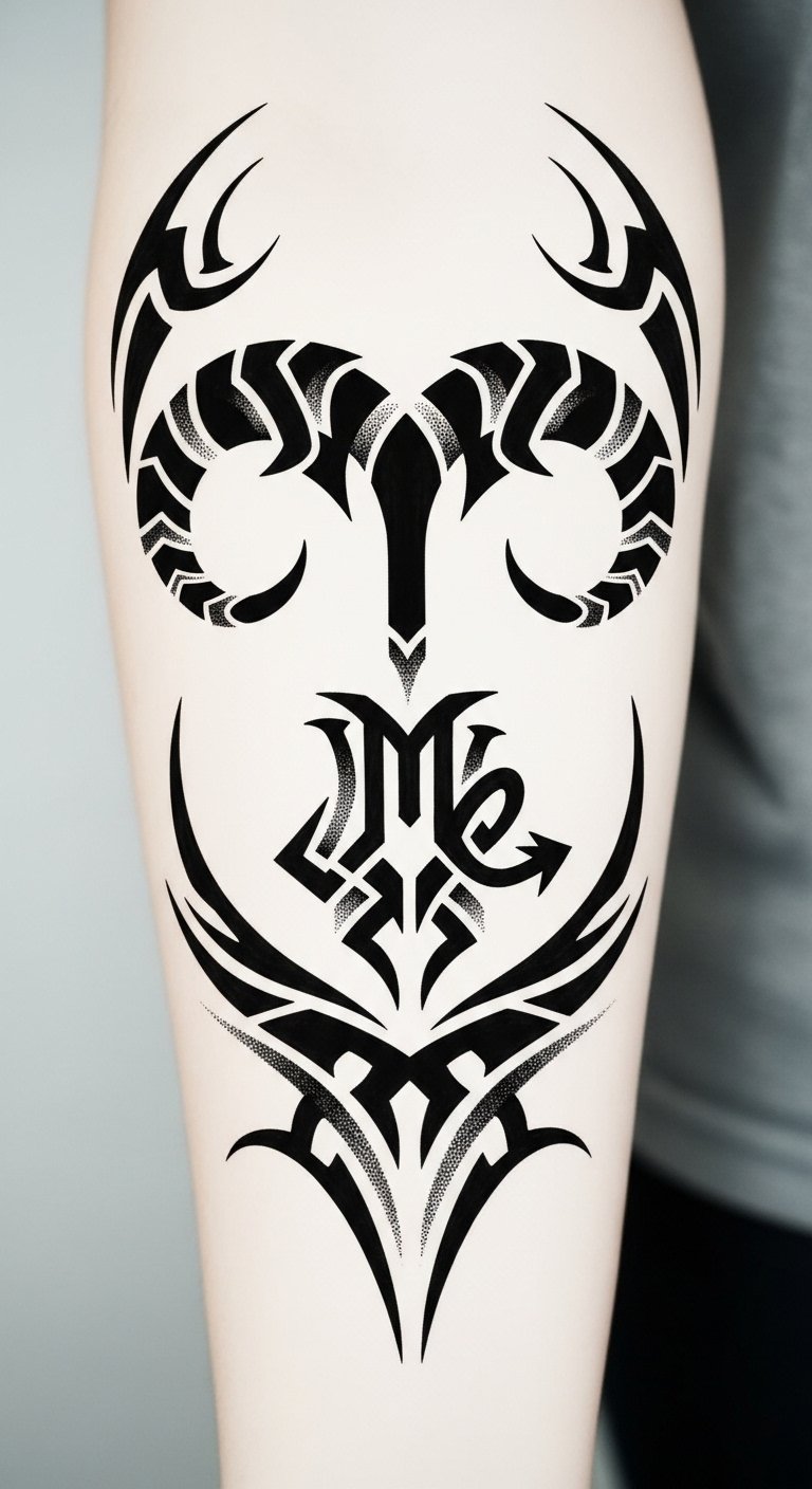 Embodying ancient strength and contemporary identity, this design fuses the zodiac glyph with tribal motifs to convey roots, resilience, and self-expression; the bold patterns and negative-space elements create visual rhythm that reads clearly at a distance yet rewards close inspection, invoking feelings of empowerment and connection to heritage.
