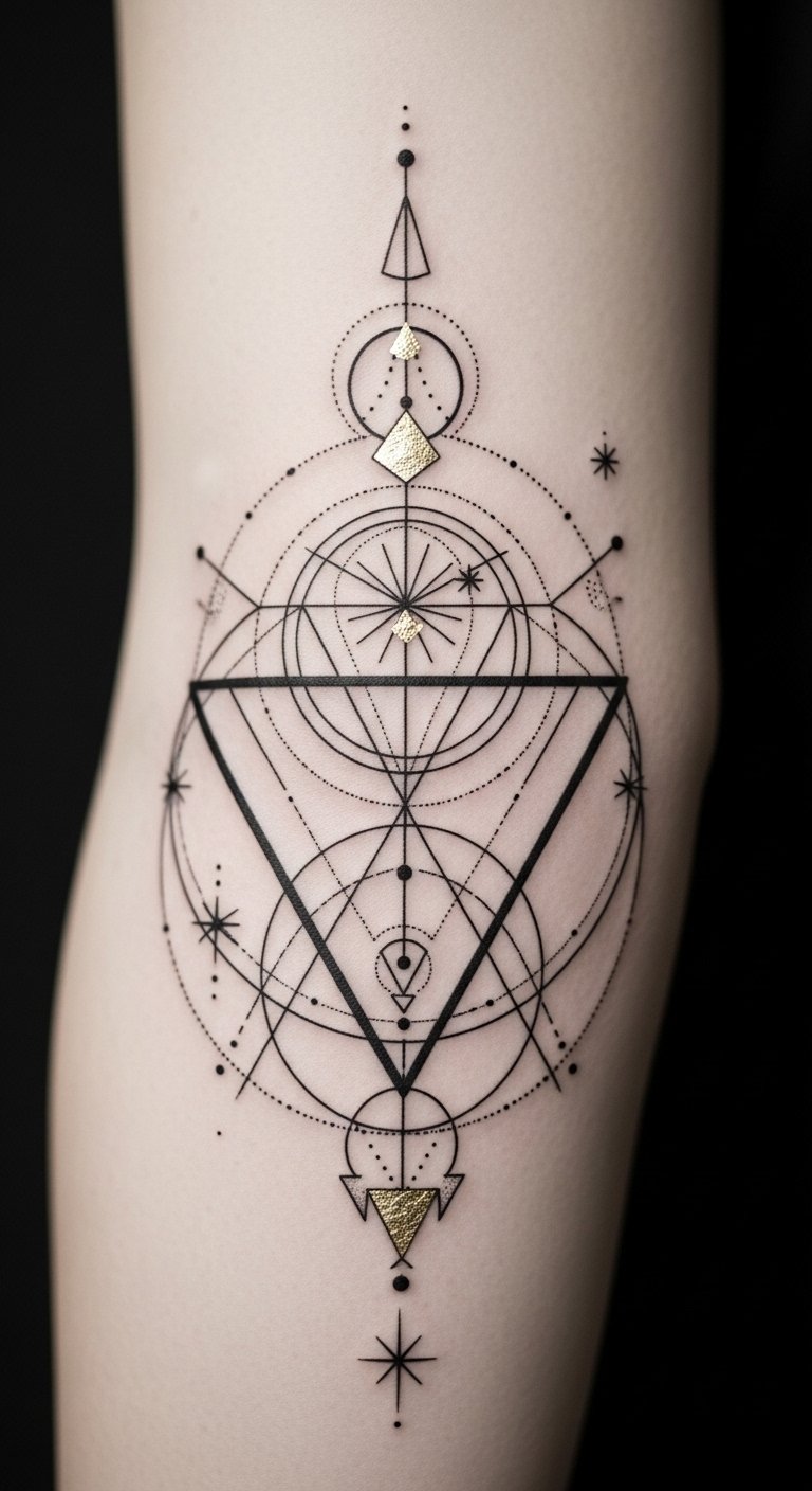The concept uses angular geometry to evoke strength and clarity, concentric circles for inner balance, and delicate dotwork stars to suggest cosmic connection; emotionally it reads as confident and introspective, suitable for visible placements like the inner forearm to share identity, the nape for subtle mystery, or the ribcage for private, intimate expression.