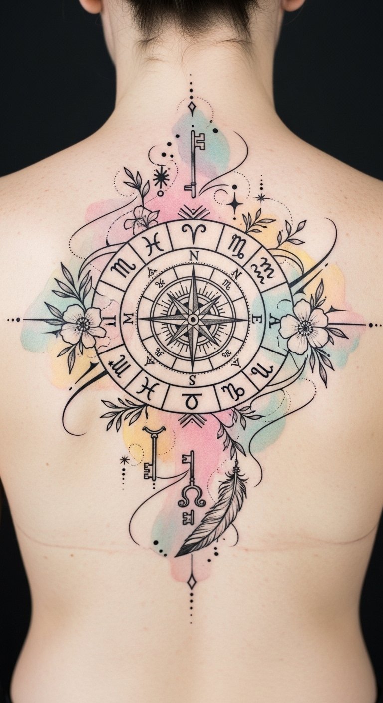 As zodiac tattoos have evolved over the centuries, they’ve transformed from simple astrological symbols into intricate works of art that reflect personal identity and spiritual beliefs. You’ll find that the rich zodiac history reveals a deep connection to tattoo symbolism, allowing you to explore your essence. Embrace this journey, and let your zodiac tattoo tell your unique story, celebrating freedom and authenticity. The design melds tradition and modernity: the celestial compass anchors purpose, constellations trace personal fate, and keys/feathers symbolize unlocking self and lightness of spirit; watercolor washes convey emotional depth while fine-line details invite intimate viewing. Ideal placement is upper back for a statement piece or ribcage for a private, sensual expression; sizing should allow the delicate elements room to breathe so the storytelling remains clear over time.