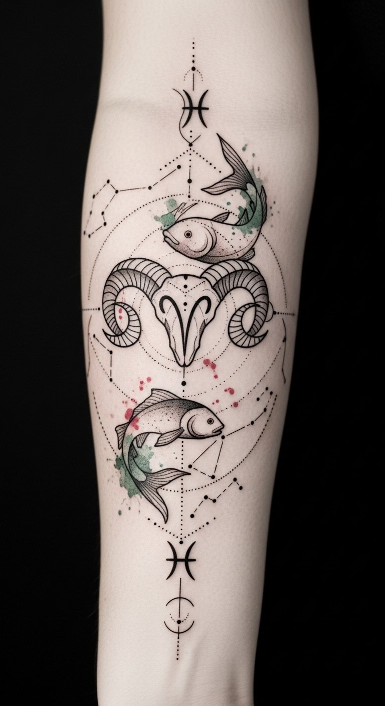Each zodiac sign carries a unique symbolism that resonates deeply with those who bear them. Rooted in zodiac mythology, these symbols reflect cosmic influences that shape your personality and destiny. Aries embodies courage, while Pisces symbolizes intuition. By understanding these meanings, you reveal a deeper connection to your essence, embracing the freedom to express your individuality through stunning zodiac tattoos that celebrate your spirit. The design blends Aries’ boldness and Pisces’ fluid sensitivity into a single motif: the ram horns provide structure and strength, the two fish add motion and empathy, and the constellations tie the piece to fate and cosmic guidance. Emotionally it balances assertiveness and vulnerability, ideal for someone embracing both leadership and compassion; place it as a wrap-around forearm band to allow movement to animate the intertwined elements and to keep the piece visible as a personal talisman.