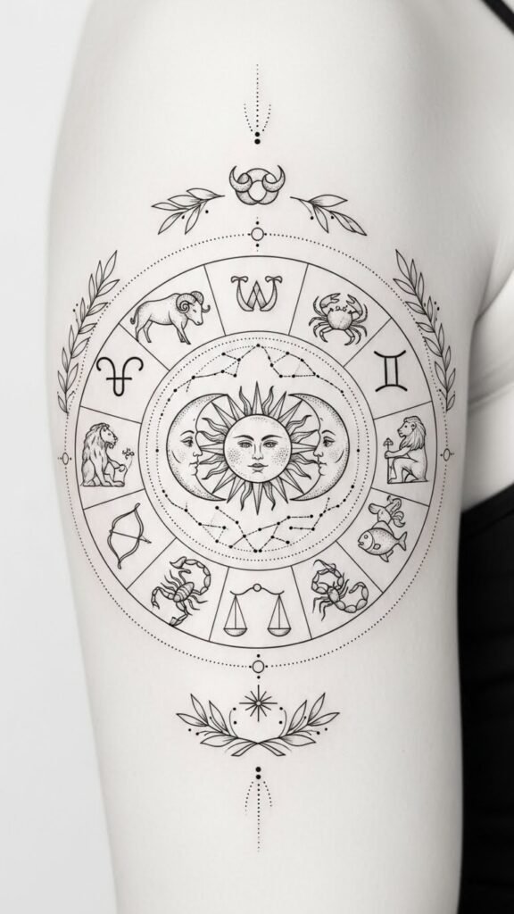Astrological chart tattoos embody personal mythology: the central natal wheel rendered in fine black lines with constellation dots in white ink, delicate planetary glyphs placed exactly where they fall in the chart, and soft watercolor washes in natal-sign colors to accent houses; emotional resonance is intimate and empowering, a visible map of strengths and vulnerabilities that can comfort or challenge the wearer;