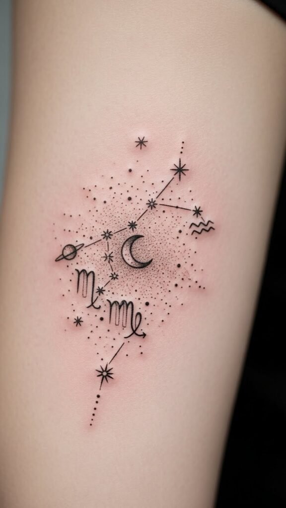 A well-placed tattoo can empower you, reminding you of your cosmic journey every day. This design pairs celestial symbols with a restrained aesthetic to evoke introspection and belonging; the constellation and crescent suggest guidance and continuity, the planetary glyphs nod to personal traits, and the forearm or behind-the-ear placement balances visibility and intimacy so the wearer feels both seen and privately anchored to their astrological path.