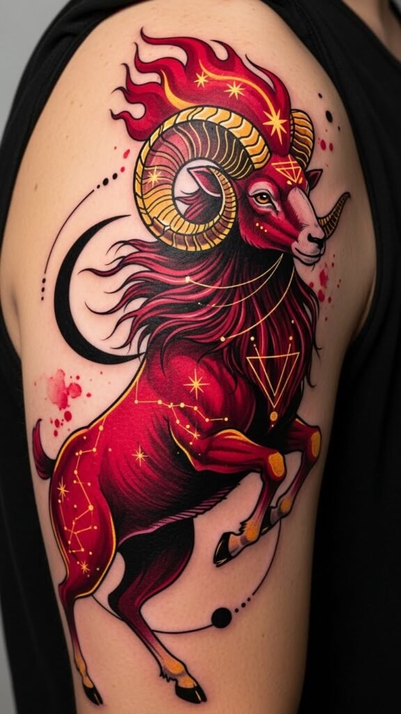 The design’s fiery colors and flowing lines evoke raw energy and motion, meant to stir confidence and assertiveness; ideal placements are the upper arm, chest, or shoulder blade where the ram’s forward momentum can follow the body’s contours, serving as a daily emblem of bravery and personal drive.