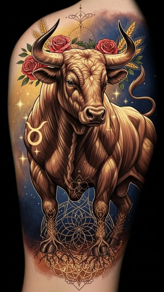 This design weaves symbolism and feeling: the bull embodies steadfast strength and resolve, roses and wheat speak to sensuality and abundance, the glyph ties it to astrological identity, and the roots/mandala ground the design in stability.