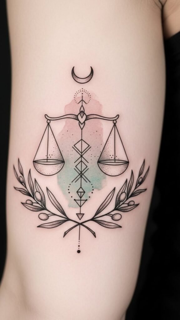 This design symbolizes fairness and love, reminding you to seek equilibrium in life. Let your Libra tattoo inspire your journey toward freedom and authentic connection. The entwined olive branches emphasize peace and reconciliation while the crescent moon and watercolor hints add emotional depth and intuition; placed on the inner forearm the piece reads as a personal daily reminder, on the ribcage it becomes a private talisman, both locations supporting the themes of balance, elegance, and inner freedom.