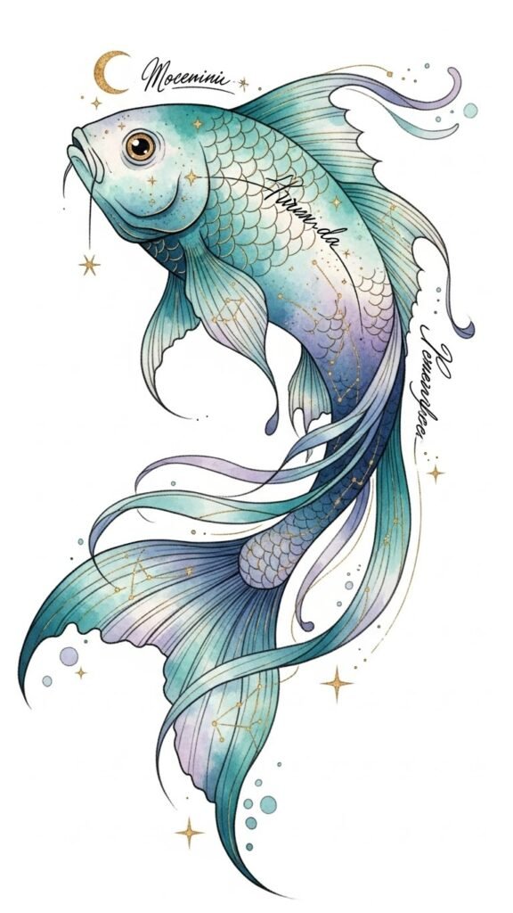 A Pisces tattoo can serve as a reminder to embrace your fluidity, celebrating creativity and freedom as you navigate life’s vast ocean of possibilities. The design’s watercolor tones and gold accents emphasize emotional depth and mysticism; the ribbons-to-constellations transition symbolizes the bridge between inner dreams and higher guidance.