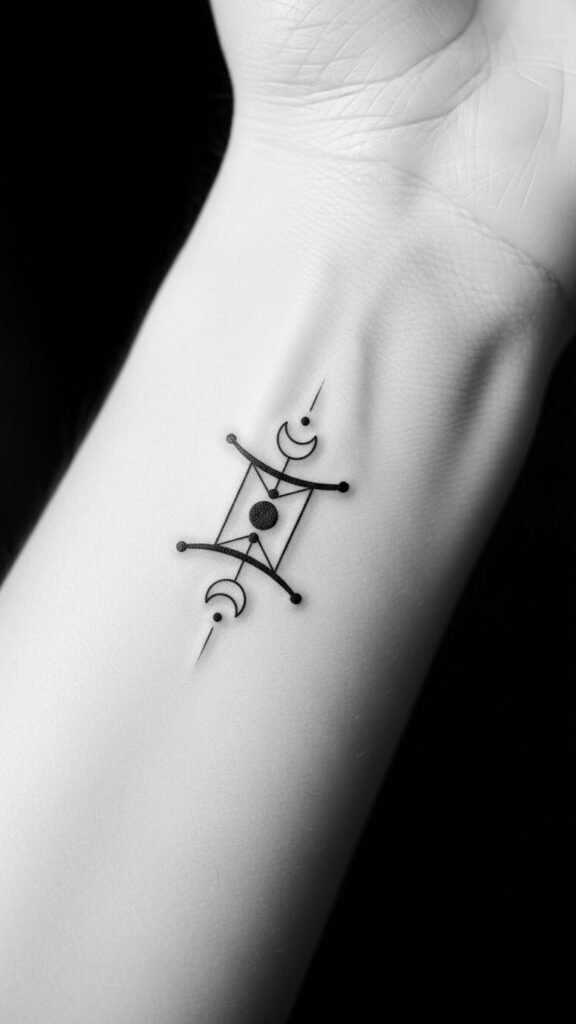The design combines precise geometry and celestial motifs to symbolize balance, destiny, and personal evolution; placed on the forearm it reads as a personal talisman visible to the wearer, or on the upper back it becomes a private emblem that evokes quiet strength and connection to the cosmos.