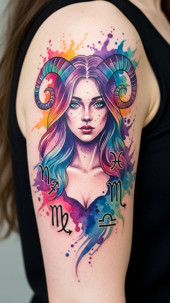 This design translates the original watercolor zodiac description into a tattoo: a flowing, painterly representation of the chosen astrological symbol surrounded by abstract washes and splatters in a vivid palette, integrating fine-line details of constellations and subtle negative-space elements. Symbolically it blends cosmic identity and personal freedom, evoking emotional depth and movement; ideal placements are the forearm, shoulder blade, or ribcage where the elongated, flowing composition can follow the body’s natural contours and feel intimate and alive.