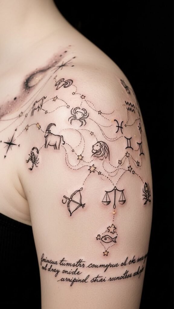 Each design embodies spiritual significance, channeling unique zodiac energy that resonates deeply within you. These tattoos remind you of your cosmic roots, empowering your journey toward self-discovery, freedom, and a profound connection to the universe.