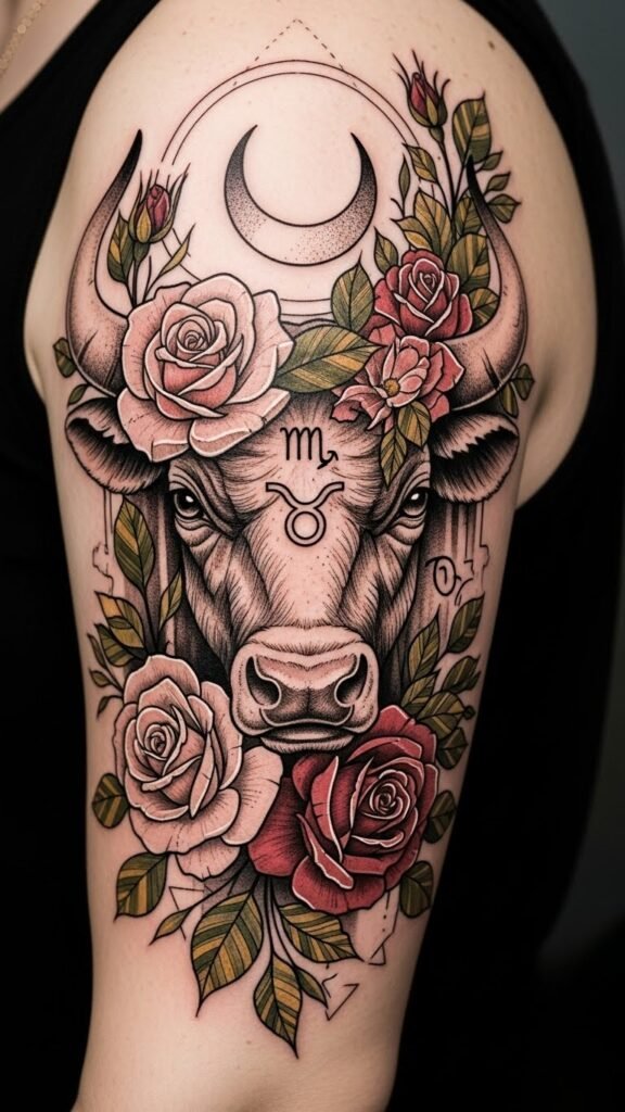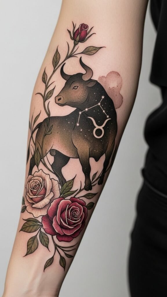 This design pairs the bull’s grounded strength with roses for tenderness and the Taurus glyph for identity; placement on the upper forearm or shoulder lets the wearer display resolve and intimacy simultaneously, evoking steady determination and quiet pride.