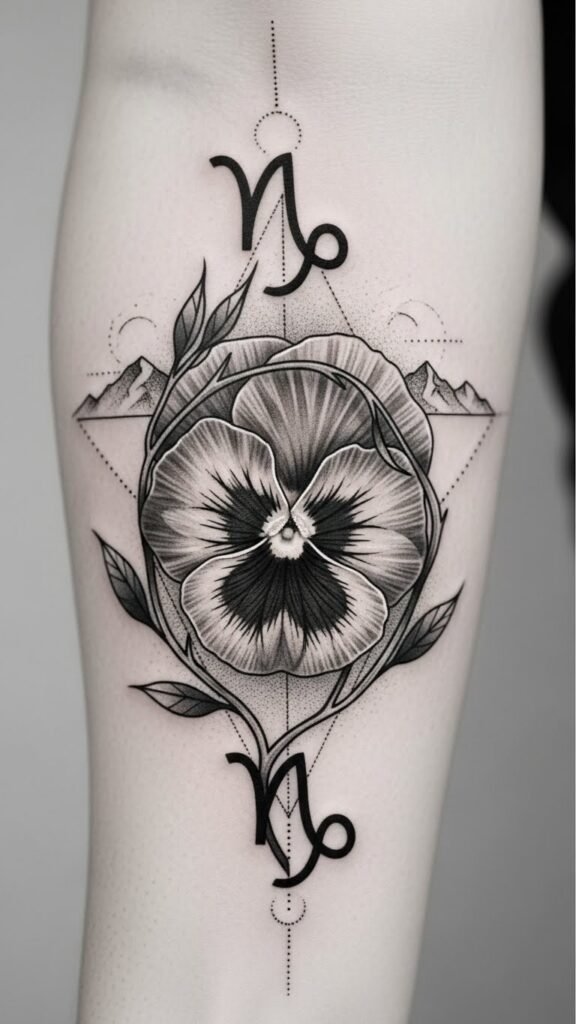 Pansy symbolism reflects love and intuition, perfectly complementing Capricorn characteristics like resilience and ambition. This fusion creates a tattoo that not only celebrates your zodiac but also embodies your journey toward freedom and self-expression.