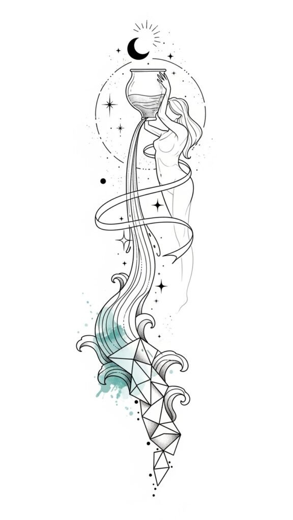 Choose this tattoo to celebrate your visionary essence. This design emphasizes movement and transformation—water and stars representing ideas poured into the world—evoking calm confidence and a sense of open-hearted outreach; it suits placements that follow the body’s natural vertical lines (inner forearm, spine, ribcage) to enhance the sense of flow and personal expression.