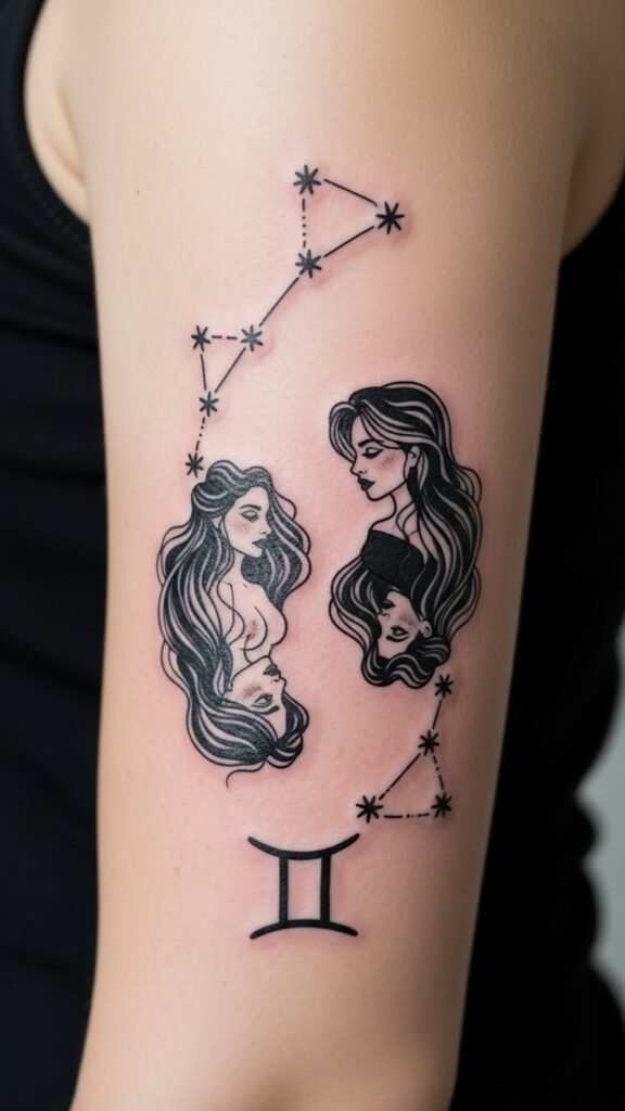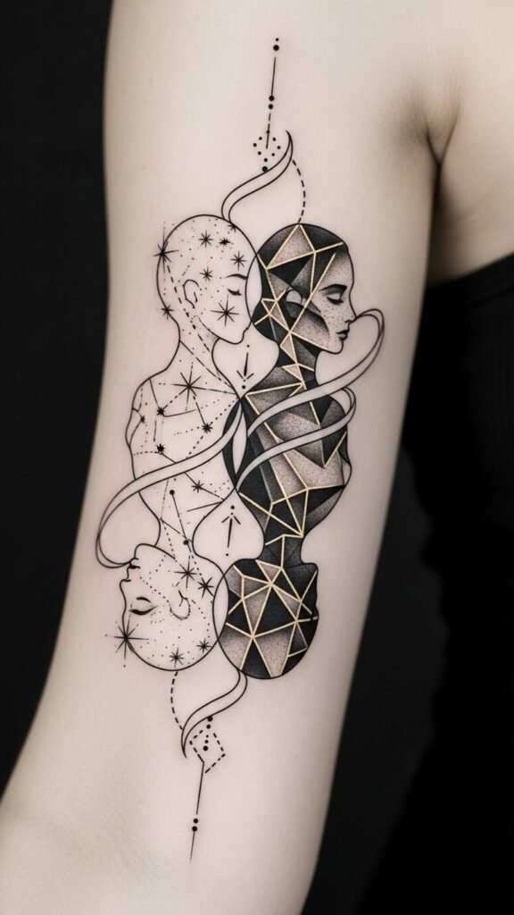 Explore symbolism of duality, connection, and transformation with this design: two intertwined figures formed from delicate linework and dotwork constellations, mirrored but distinct—one shaded, one open—connected by a ribbon of tiny stars and a subtle heartbeat line; optional small moon and sun accents; scale for forearm or upper back. This concept channels Gemini’s twins and ever-evolving spirit, evoking freedom, curiosity, and balance between opposites; it invites personal interpretation and emotional resonance, working well along the forearm to show motion and interaction, or centered on the upper back for symmetry and presence.