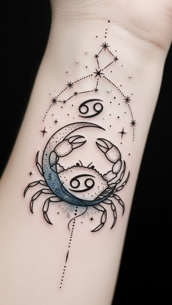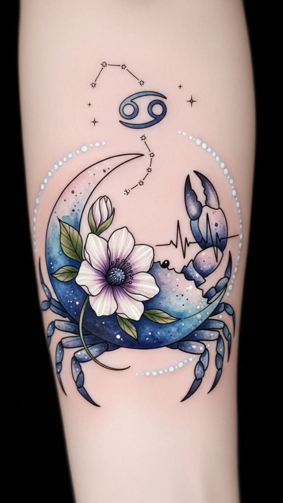 The emotional depth found in Cancer tattoos often intertwines beautifully with celestial elements, enhancing their significance.