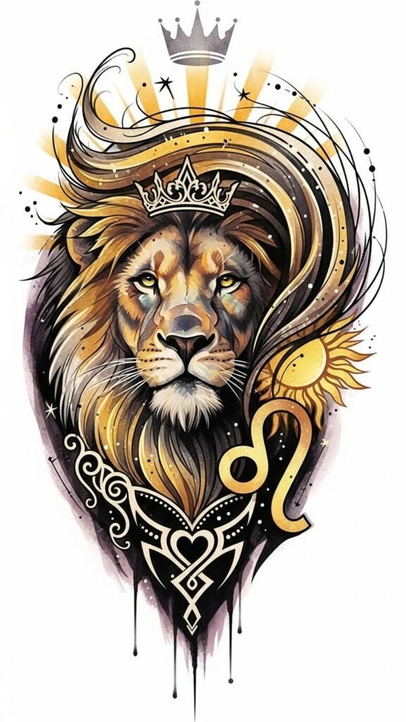 With a Leo tattoo, you declare your identity, celebrating the freedom and confidence that come with being your true self. This concept blends regal symbolism with emotional intensity—gold tones for vitality, crimson washes for passion, and the Leo glyph woven into the mane to signify identity and astrological pride.