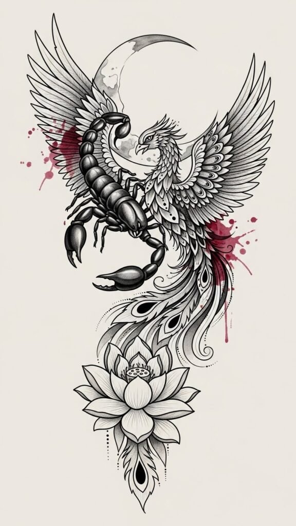This design pairs the scorpion’s guarded intensity with the phoenix’s regenerative fire to symbolize cyclical transformation and inner fortitude; the infinity loop composition conveys endurance, the fine dotwork and filigree add a personal, almost talismanic feel, and placement on the forearm or ribcage lets the piece sit close to the body where its emotional resonance can be both private and visible as desired.