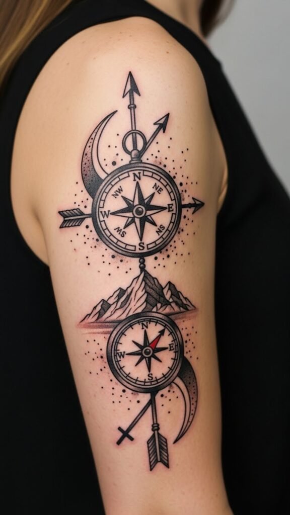 Emotionally, the piece celebrates independence and curiosity—placing it along the forearm or upper back lets the arrow follow the body’s natural lines, suggesting forward motion, while a smaller wrist or ankle version keeps the sentiment intimate and personal.
