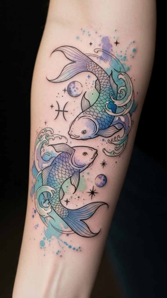 Delicate watercolor washes in soft blues, lilacs, and seafoam greens mingle with fine-line constellations, a pair of stylized fish circling in yin-yang motion, and faint wave and celestial motifs; ideal for a forearm, ribcage, or upper back to allow flow with body contours.
