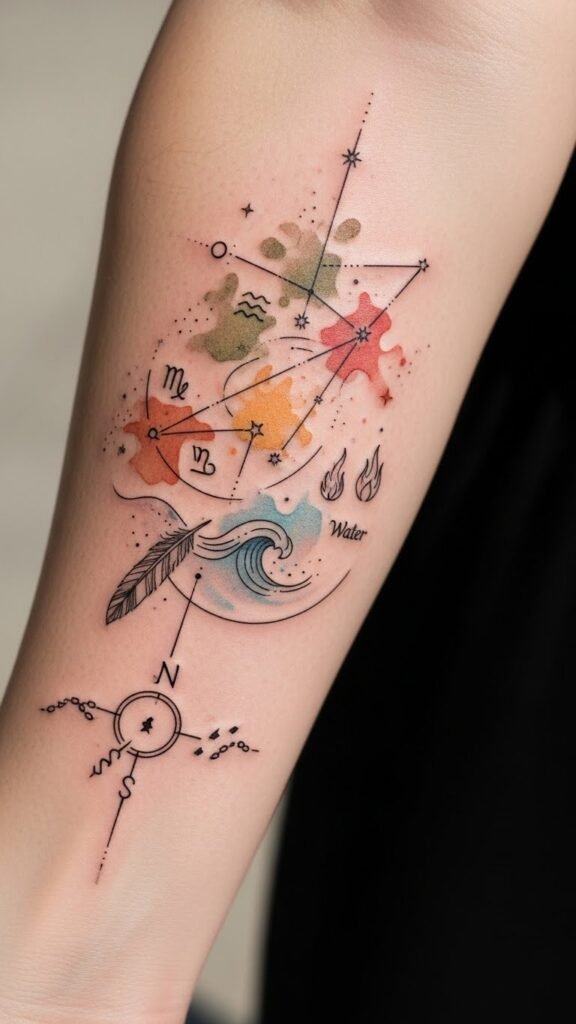 While zodiac tattoos often embody individual astrological symbols, personalizing them can elevate their significance to a whole new level. Imagine your unique journey reflected in personalized constellations or zodiac element combinations that resonate with your spirit. Each symbol becomes a powerful reminder of your freedom, guiding you towards self-discovery and deeper meaning. Let your ink tell your story in a way that’s distinctly yours. This design weaves those ideas into a visual narrative: the constellation maps personal paths, the element color reflects temperament, and the compass or broken chain underscores liberation and self-direction. Placed on the inner forearm, the tattoo stays intimate yet visible, offering a daily emotional anchor and a graceful line that moves with the arm, inviting both introspection and quiet declaration.