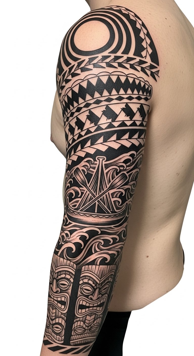 The composition places the sun motif over the deltoid to symbolize guidance and life force, shark teeth bands on the biceps for protection and courage, wave lines flowing toward the wrist to represent journey and adaptability, tiki faces near the inner arm to watch over the wearer, and the canoe centered on the forearm to signify leadership and voyage.