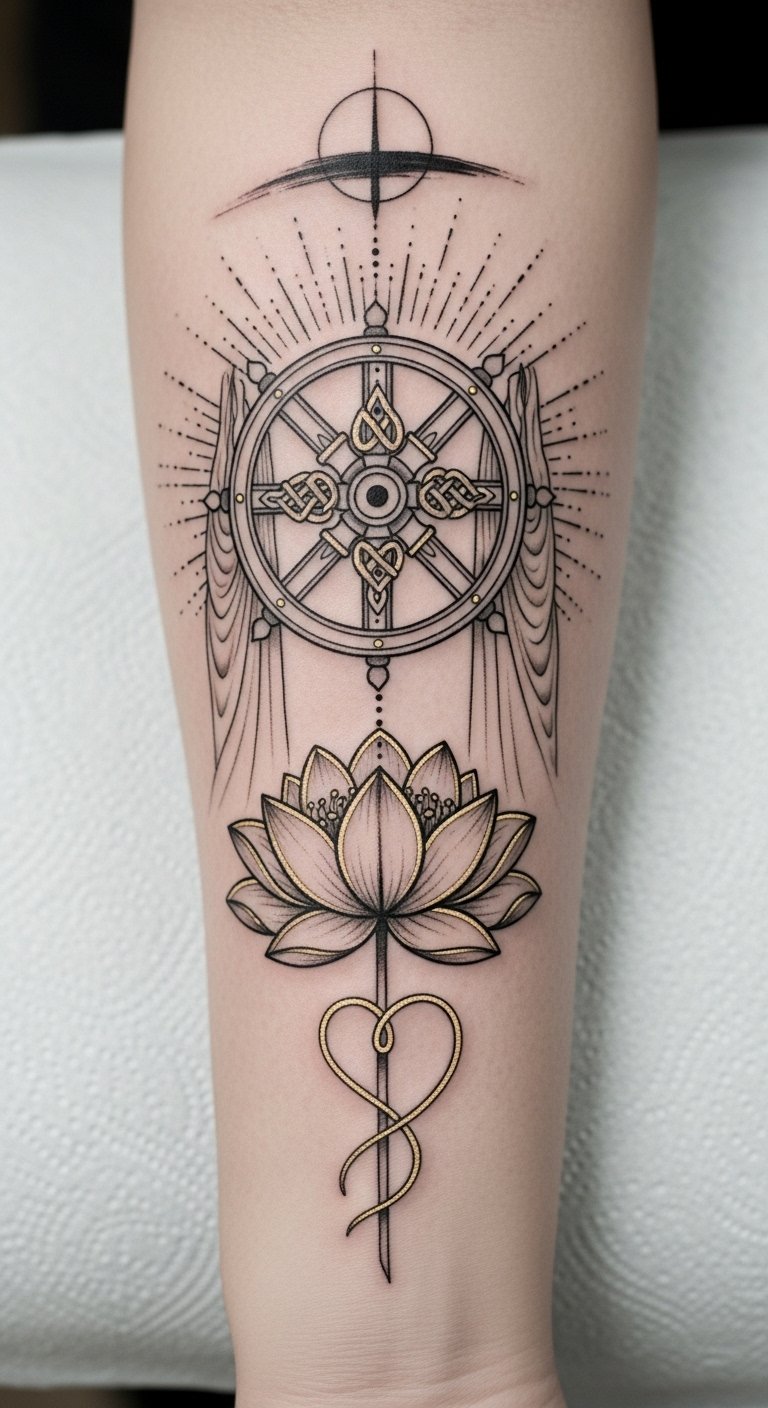 The design weaves together enlightenment and compassion: the Dharma wheel anchors the piece as the path of the Dharma, the half-bloom lotus symbolizes rising from suffering toward purity, and the karma knots in the spokes represent interconnected actions and consequences.