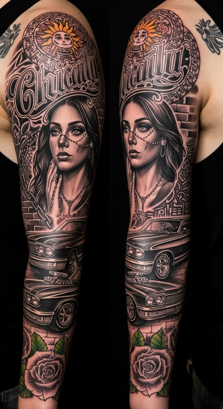 With each design, you engage in visual storytelling, celebrating freedom and the richness of your journey. This sleeve combines elements that symbolize family, faith, resilience, and cultural pride—the lowrider for neighborhood roots and movement, the rosary and portrait for devotion and loved ones, roses for love and sacrifice, and the Aztec sun for ancestral strength.