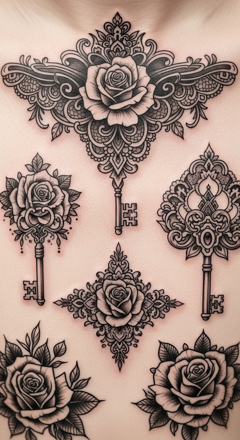 A forearm or upper chest piece centered on an antique brass key entwined with a blooming rose and trailing lace filigree; muted sepia tones with selective deep crimson for the rose, fine line shading and dotwork to enhance texture, small hidden symbols (a pocket watch, a moth) integrated into the lace. Symbolically this design balances love and memory (rose and pocket watch), secrecy and discovery (key), and transformative yearning (moth); emotionally it evokes bittersweet nostalgia and quiet defiance. Ideal placement follows musculature for flow—wraps slightly around the arm or nestles over the sternum to read both intimate and proudly visible.