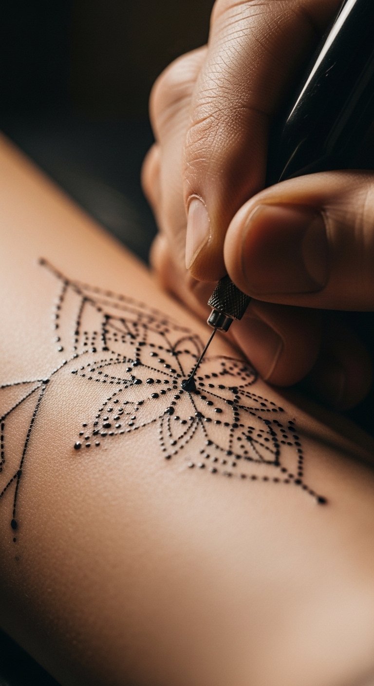 You’ll appreciate the rhythmic process of ink meeting skin, as handpoke techniques allow for intricate designs that reflect your individuality, celebrating the freedom of self-expression through art. The concept evokes quiet reverence and personal storytelling—each dot and line representing deliberate care and patience; emotionally it speaks to authenticity, trust, and the meditative nature of slow craft.