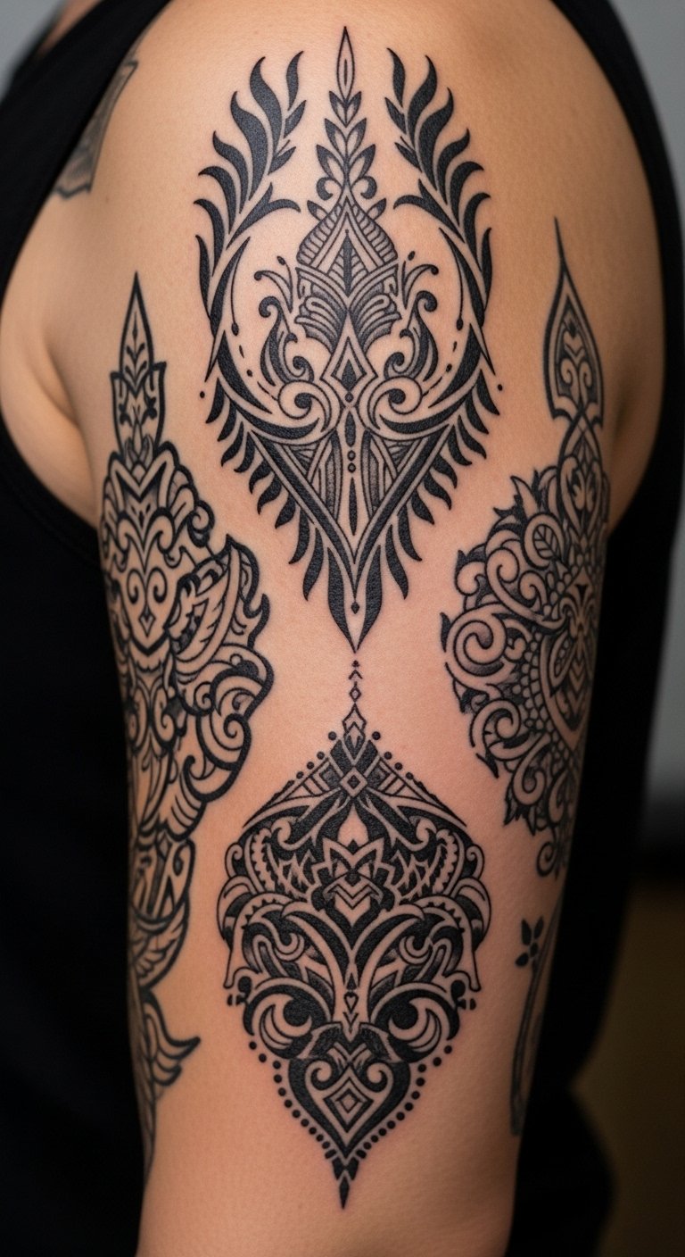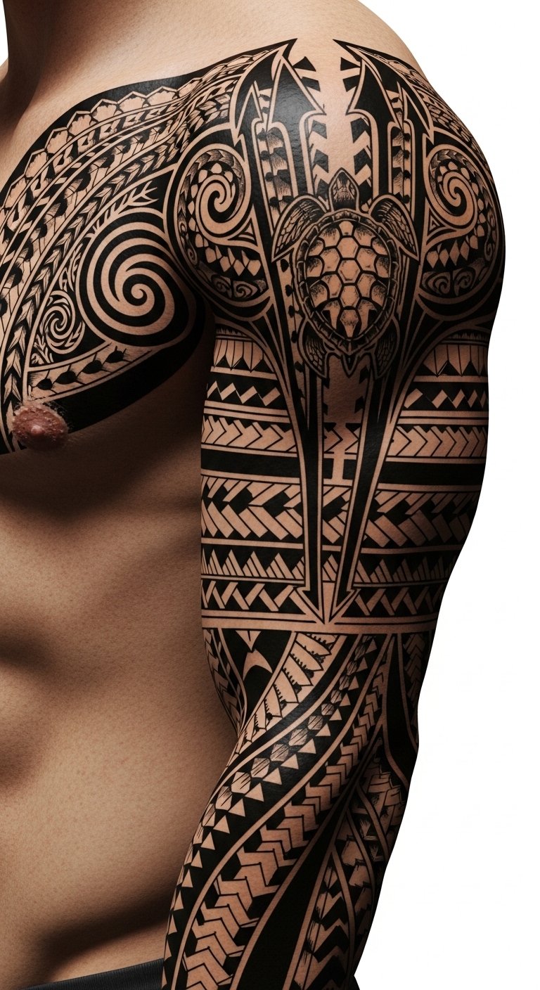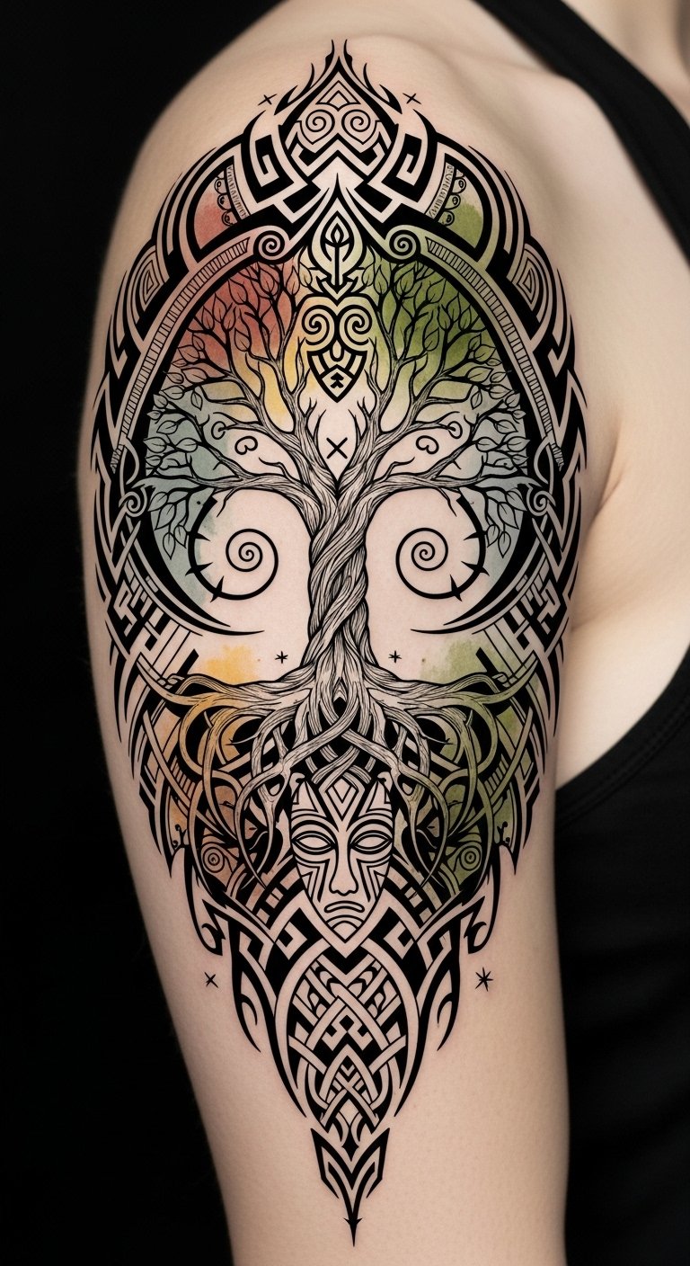 Emotionally it speaks to pride in ancestry and personal evolution—placement along the shoulder blade and outer arm allows the piece to follow the body’s natural movement, visible enough for expression yet easily covered, and the adaptable sleeve-ready layout supports future additions that reflect ongoing life changes.
