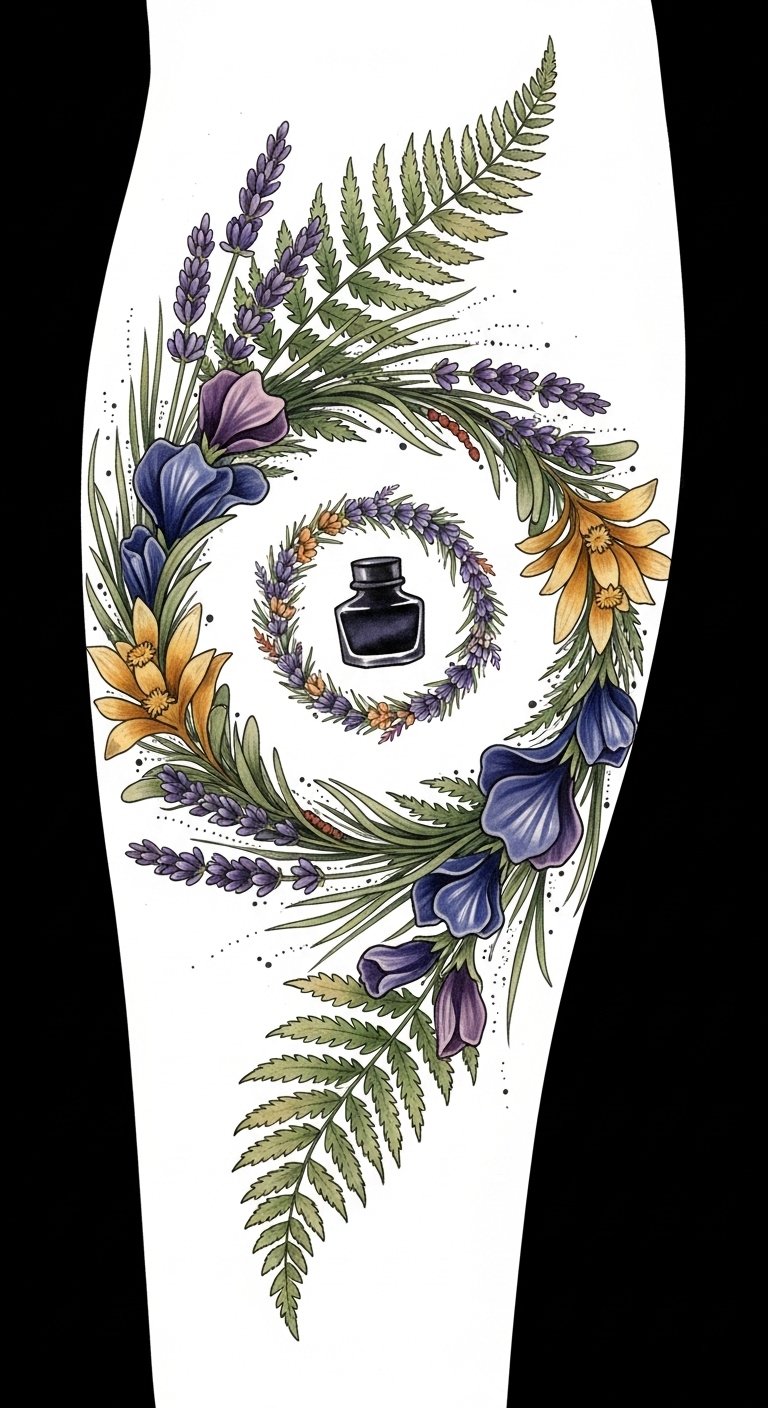 The central ink bottle silhouette subtly honors the medium without overpowering the plants, evoking freedom in artistic expression and a gentle, reduced-allergy sentiment through soft, soothing colors.