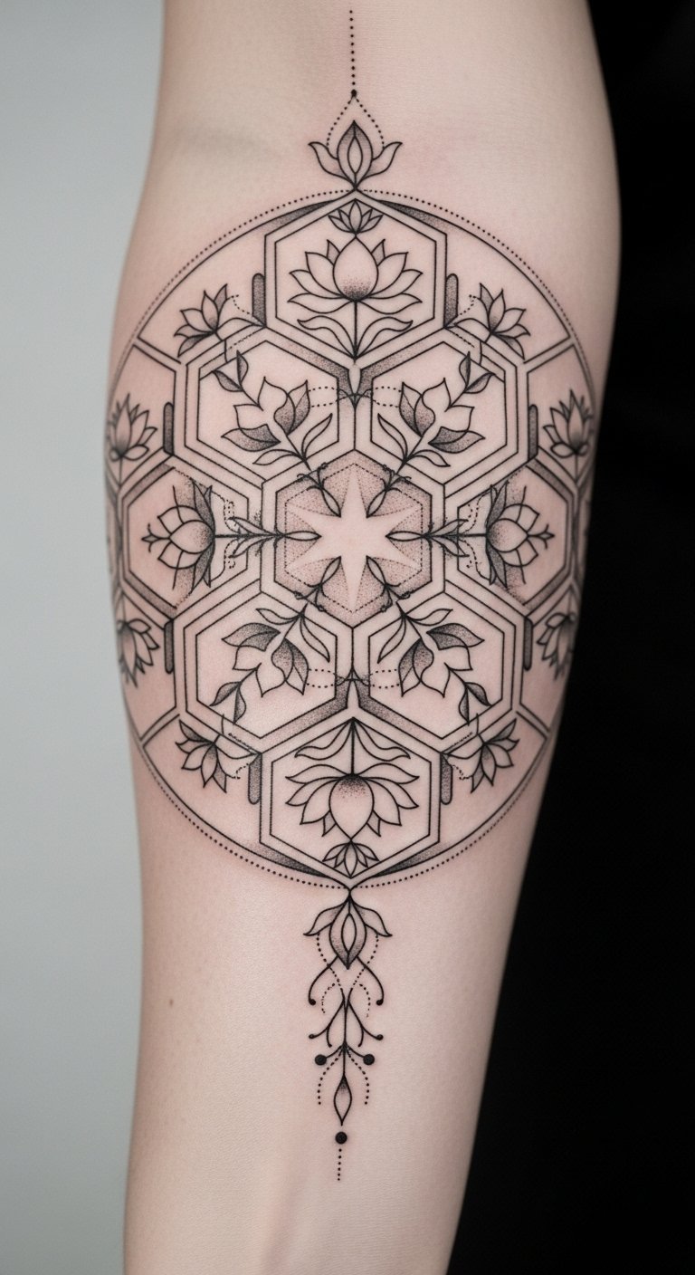 A forearm-to-shoulder wrap combining interlocking Metatron’s cube, seed of life petals, and filigree lace motifs; fine dotwork gradient, thin geometric linework, subtle negative-space stars, and soft shading for depth.