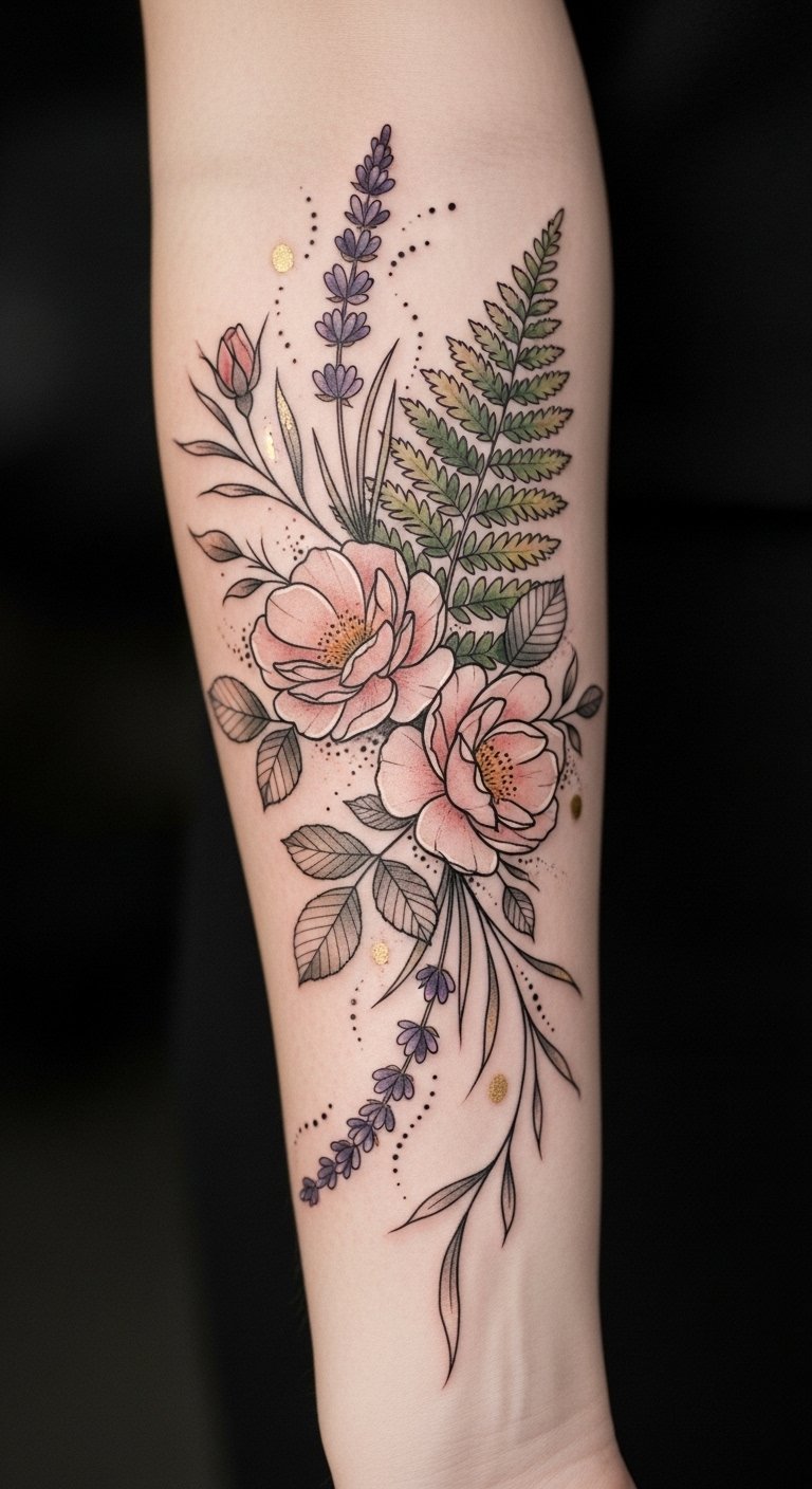 This forearm placement lets the design flow with the arm’s movement, symbolizing ongoing growth and resilience; roses speak to love and strength, lavender to calm and healing, and ferns to new beginnings—together evoking serenity and personal transformation while remaining intimate and visible for moments when you want to share your journey.