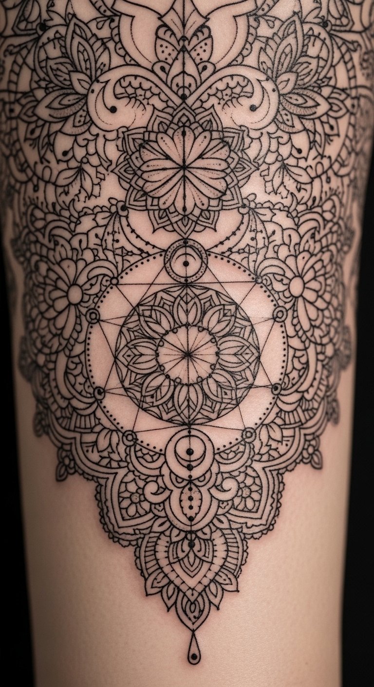 A circular mandala tattoo centered between the shoulder blades or over the sternum, combining concentric floral petals, fine dotwork, and geometric lace; incorporate thin radiating lines and subtle negative-space crescent moons to emphasize balance and expansion. Symbolically, the mandala embodies wholeness and the wearer’s path toward spiritual awakening—each layered ring marks stages of introspection and growth, lines resonating with personal truth. Emotionally the piece encourages calm, focus, and a sense of belonging to something larger; placement along the spine or chest aligns the artwork with breath and heart, reinforcing connection to inner self and the universe.