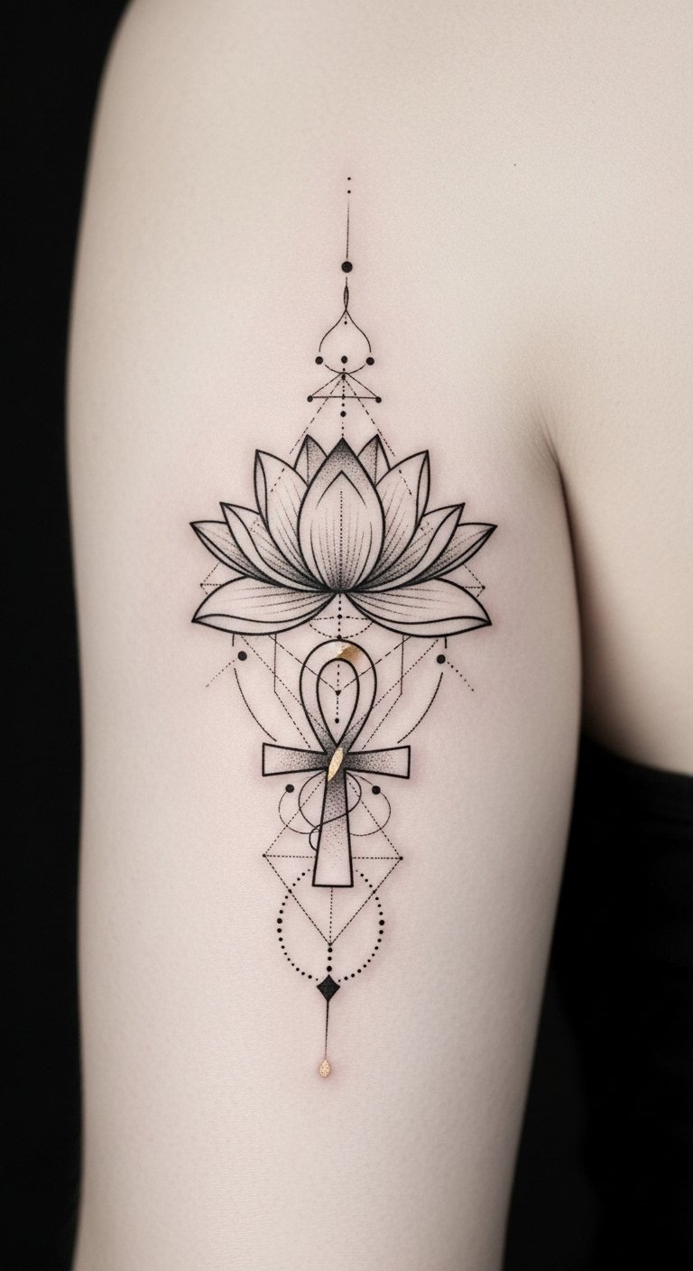 This design blends the lotus and ankh to symbolize personal awakening and the continuity of life, while the constellations suggest guidance and connection to the cosmos; the fine line and dotwork evoke quiet introspection and timeless elegance, making the inner forearm ideal for daily visibility and contemplation, and the upper back suited for a more private, sacred placement.
