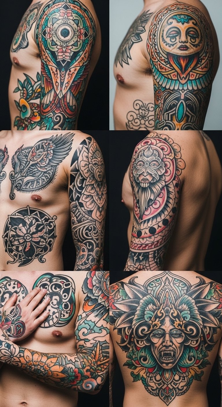 A sweeping half-sleeve concept that layers a central ancestral figure rendered in subtle realism with surrounding motifs from myth and folklore—interlaced textiles, symbolic animals, and geometric patterns—using a warm, earthy palette punctuated by vibrant accents; elevated with fine-line details and soft shading to suggest both age and motion. Symbolism: the ancestral figure grounds identity and lineage, textiles and patterns signify cultural continuity, animals represent traits or guides, and vibrant accents celebrate personal freedom and emotional highlights. Emotion: evokes pride, reverence, and intimate storytelling. Placement: upper arm to shoulder flowing toward chest for visibility and personal connection.