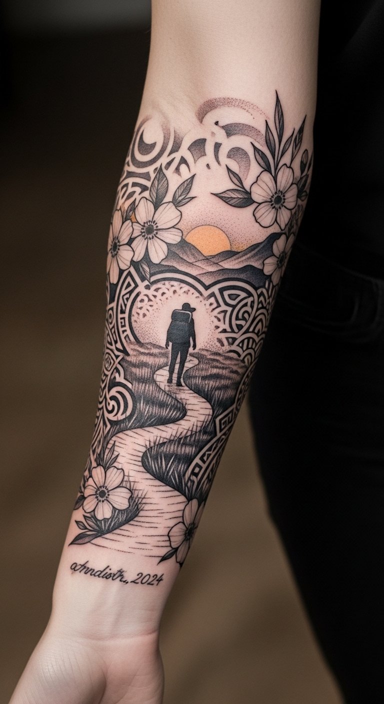 Muted color accents signal important memories without overpowering the design, while fine-line detail and dotwork create a contemplative, timeless mood. Placement on the outer forearm keeps the piece visible as a daily reminder of growth and direction, with curvature following muscle lines so it reads coherently in motion.