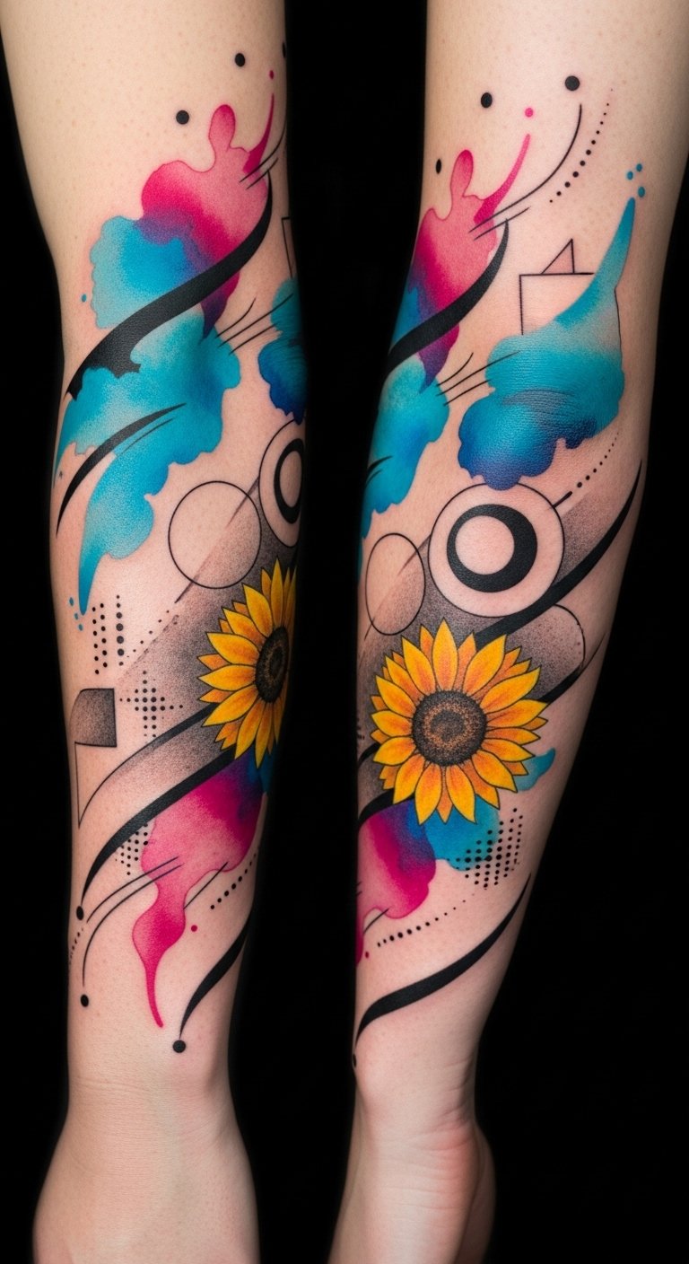 This design celebrates the original text’s invitation to experiment: vibrant color fields symbolize emotional intensity, abstract shapes represent breaking from tradition, and geometric linework grounds the composition in deliberate craft. Negative-space silhouettes create intimate pockets of personal imagery—small memories or symbols—only visible up close, giving the wearer layers of meaning. Best placed along the forearm or calf where the flowing composition can wrap and move with the body, the piece evokes liberation, curiosity, and playful introspection while remaining adaptable to individual scale and skin tone.