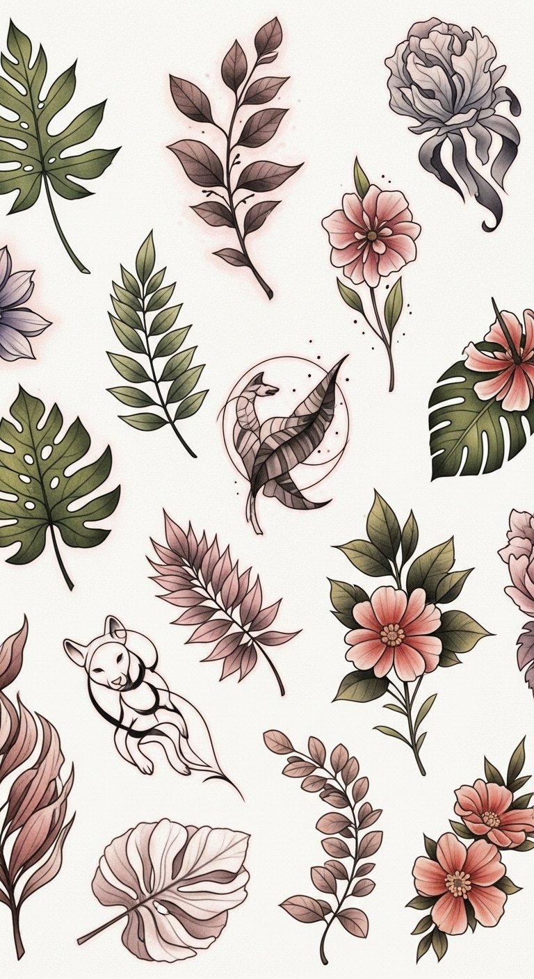 The concept pairs delicate linework leaves and a single blooming flower wrapping subtly around a forearm or ankle, with a small animal silhouette (fox or hummingbird) integrated into negative space; symbolism centers on renewal, resilience, and personal freedom, evoking calm and empowerment—ideal for visible placements like the inner wrist, forearm, shoulder blade, or behind the ear depending on desired intimacy.