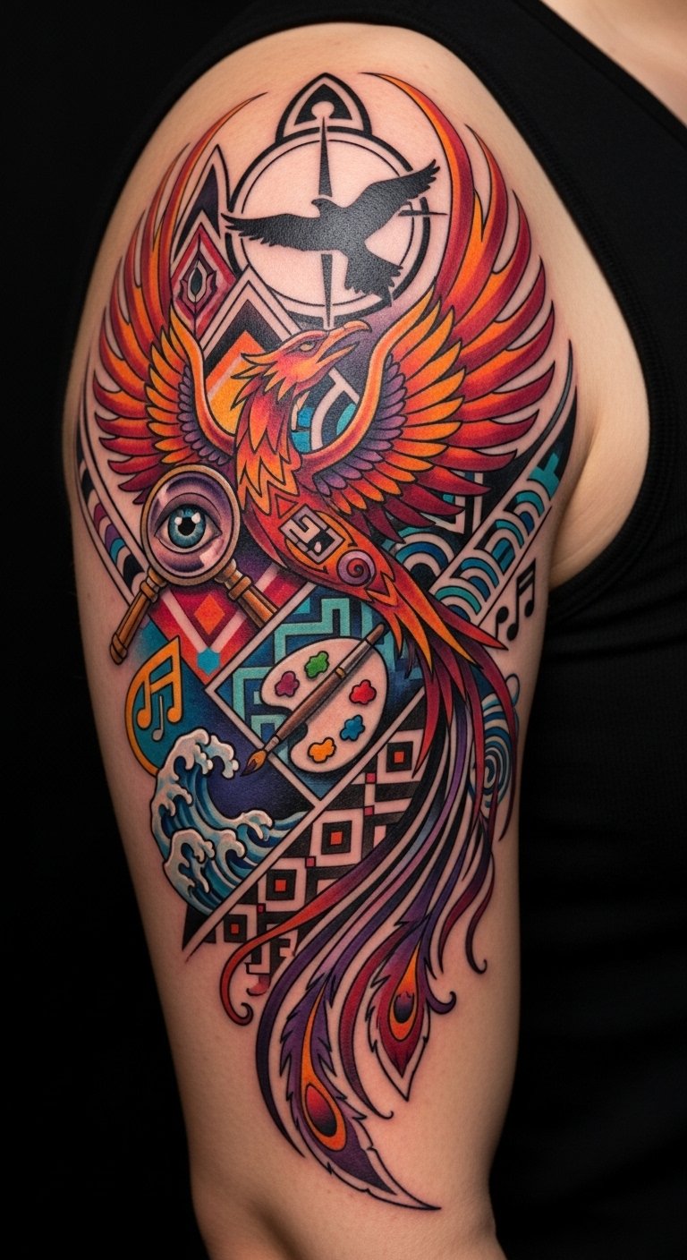 A flowing half-sleeve merging a stylized wave pattern with geometric mandala fragments and a subtle phoenix silhouette, in bold black linework with selective watercolor accents of indigo, crimson, and gold; mix fine dotwork, negative space, and brushstroke textures for contrast; size to wrap the upper arm from shoulder cap down to mid-bicep, with elements that taper to a fine tail for seamless integration with other pieces. This concept symbolizes renewal and personal evolution—traditional motifs anchored in cultural respect combine with contemporary geometry to convey balance between heritage and individuality; emotionally it evokes empowerment, creative liberation, and continuity; ideal placement on the upper arm allows visibility and concealment as desired, and the curvature complements muscle lines for a dynamic, living effect.