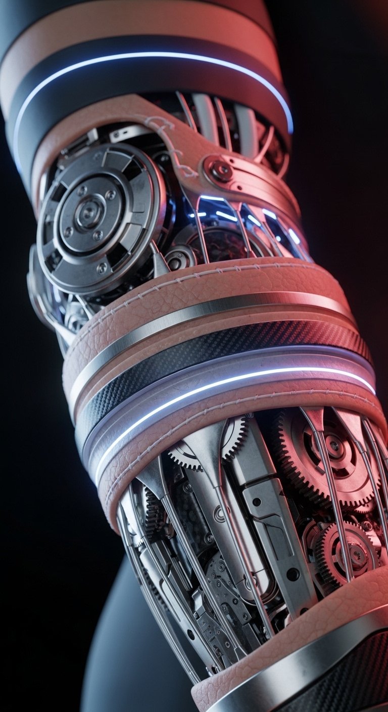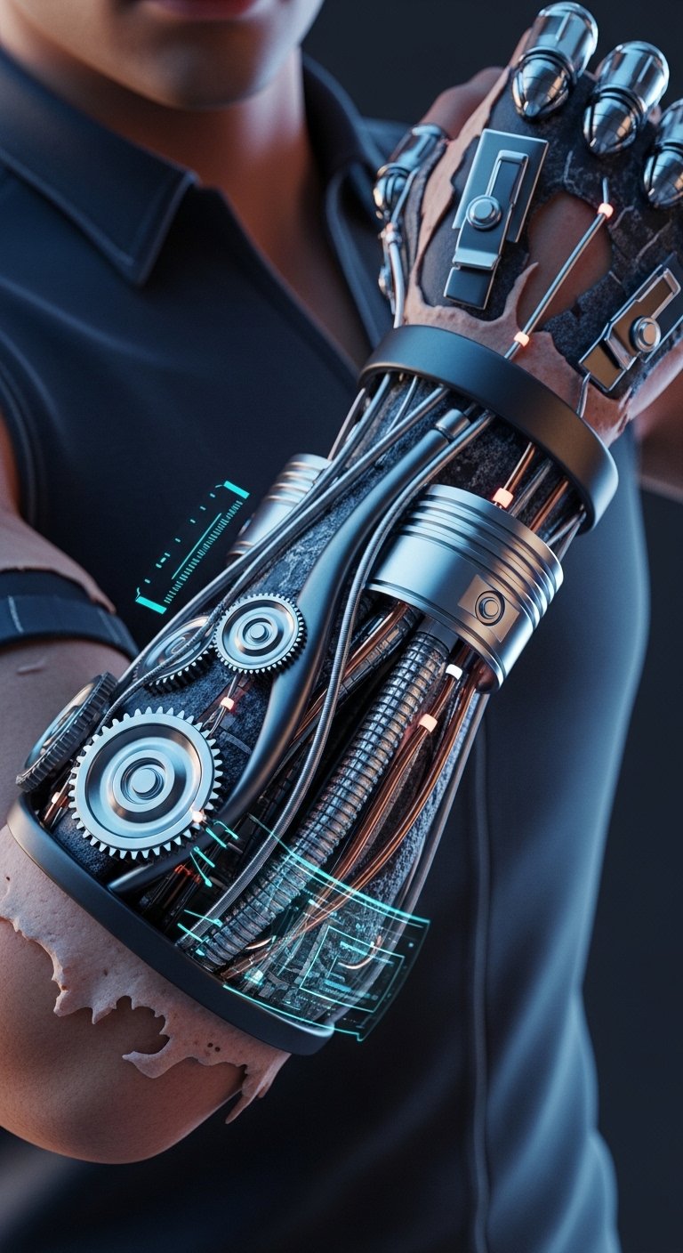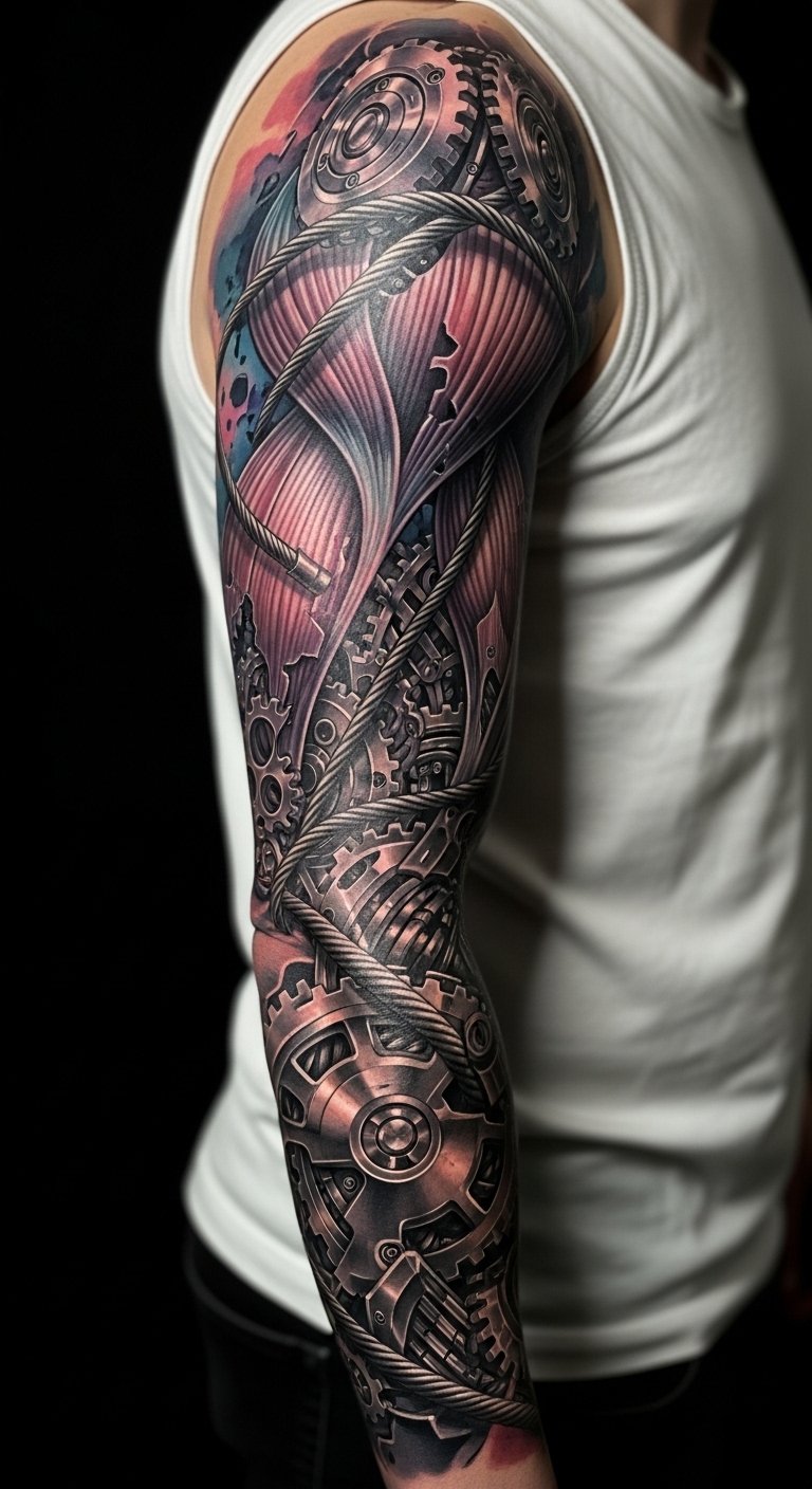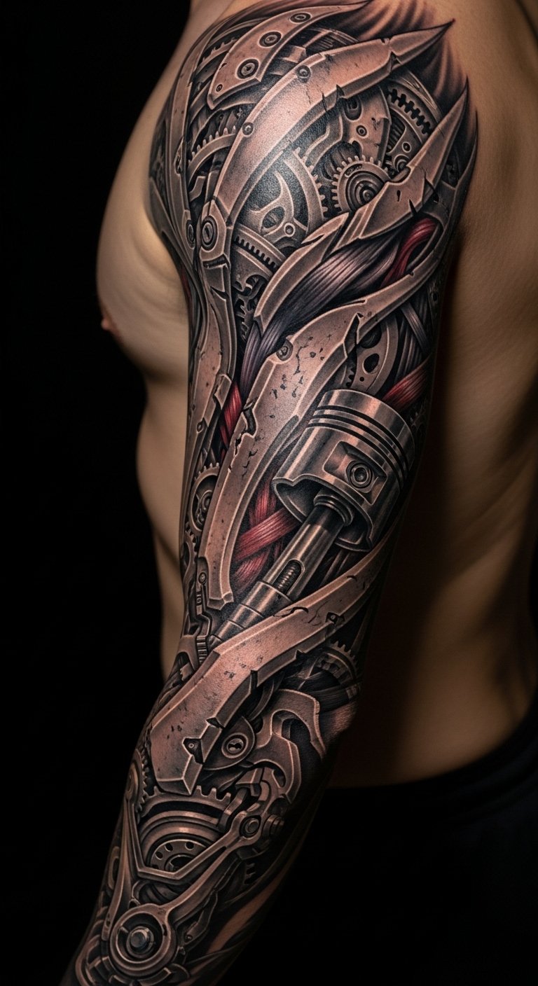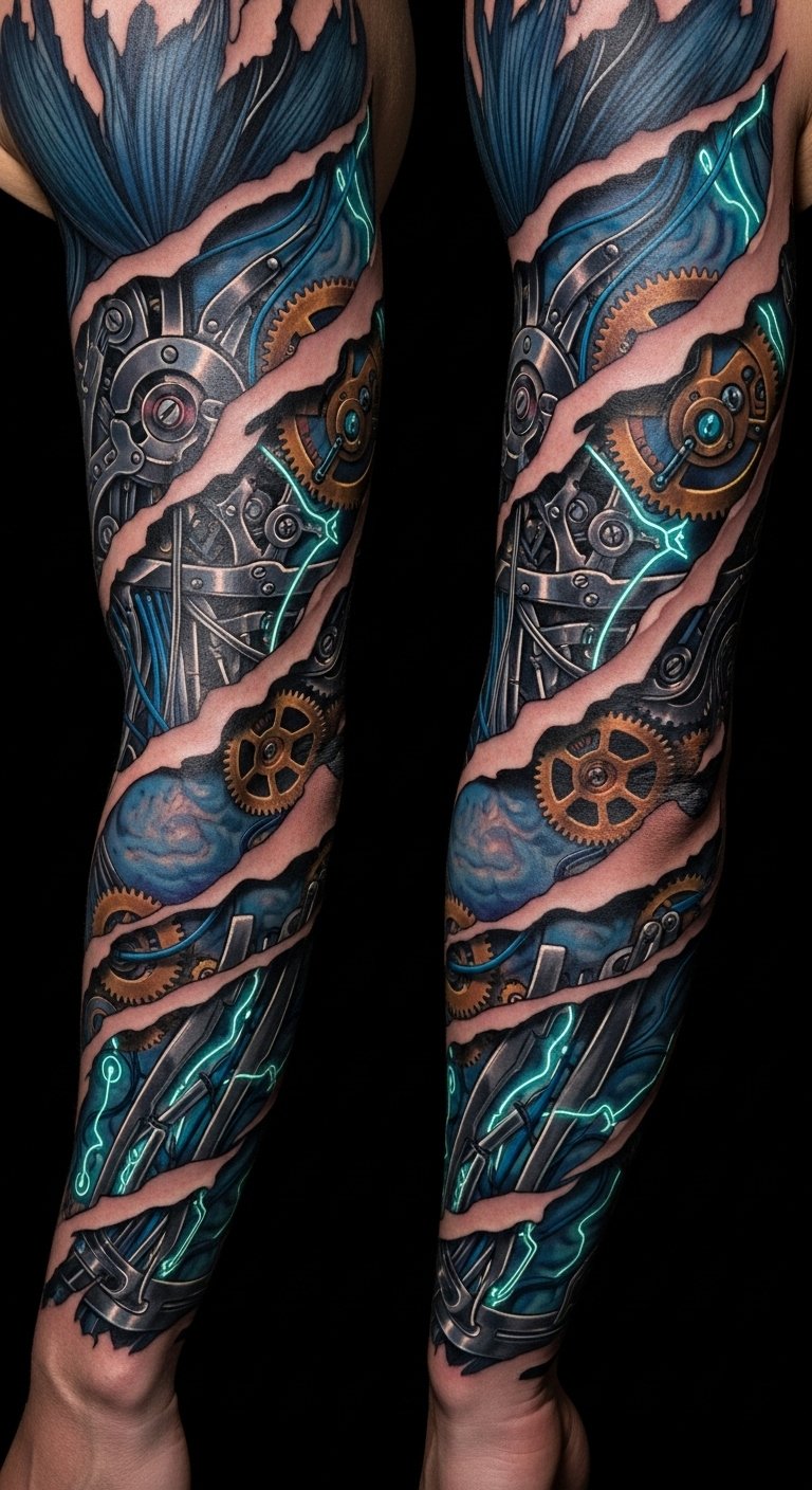 A forearm-to-shoulder wrap where exposed “mechanics” peek through torn skin—gleaming gears, flexible pistons, and braided tendons rendered in hyperrealistic shading—symbolizes the harmony of human vulnerability and engineered strength; the emotional tone is simultaneously intimate and empowering, inviting the wearer to embrace change and resilience.