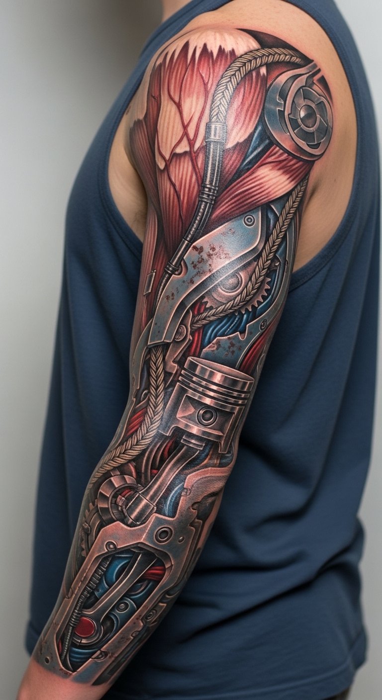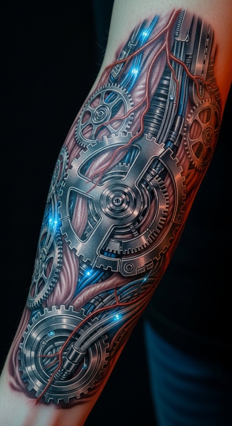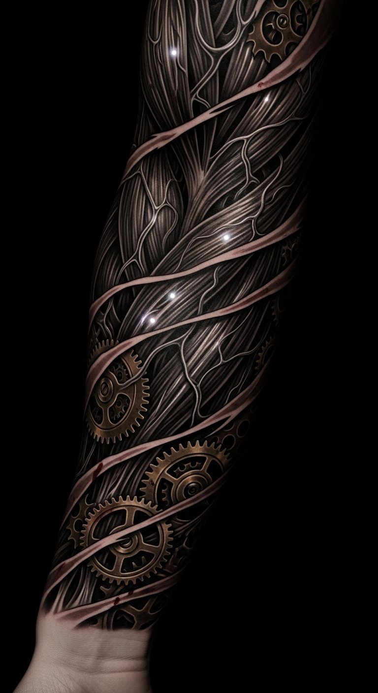 This design symbolizes the coexistence of vulnerability and strength—organic tissues entwined with mechanical components illustrate healing through adaptation and the forging of identity from both pain and innovation. Emotionally it evokes resilience, curiosity, and a controlled fierceness; placement as a forearm sleeve allows visibility for personal affirmation and concealability when desired, following the musculature to enhance motion and the illusion of movement within the mechanics.