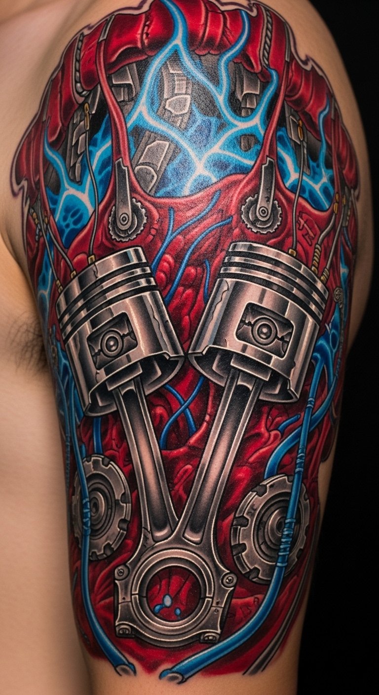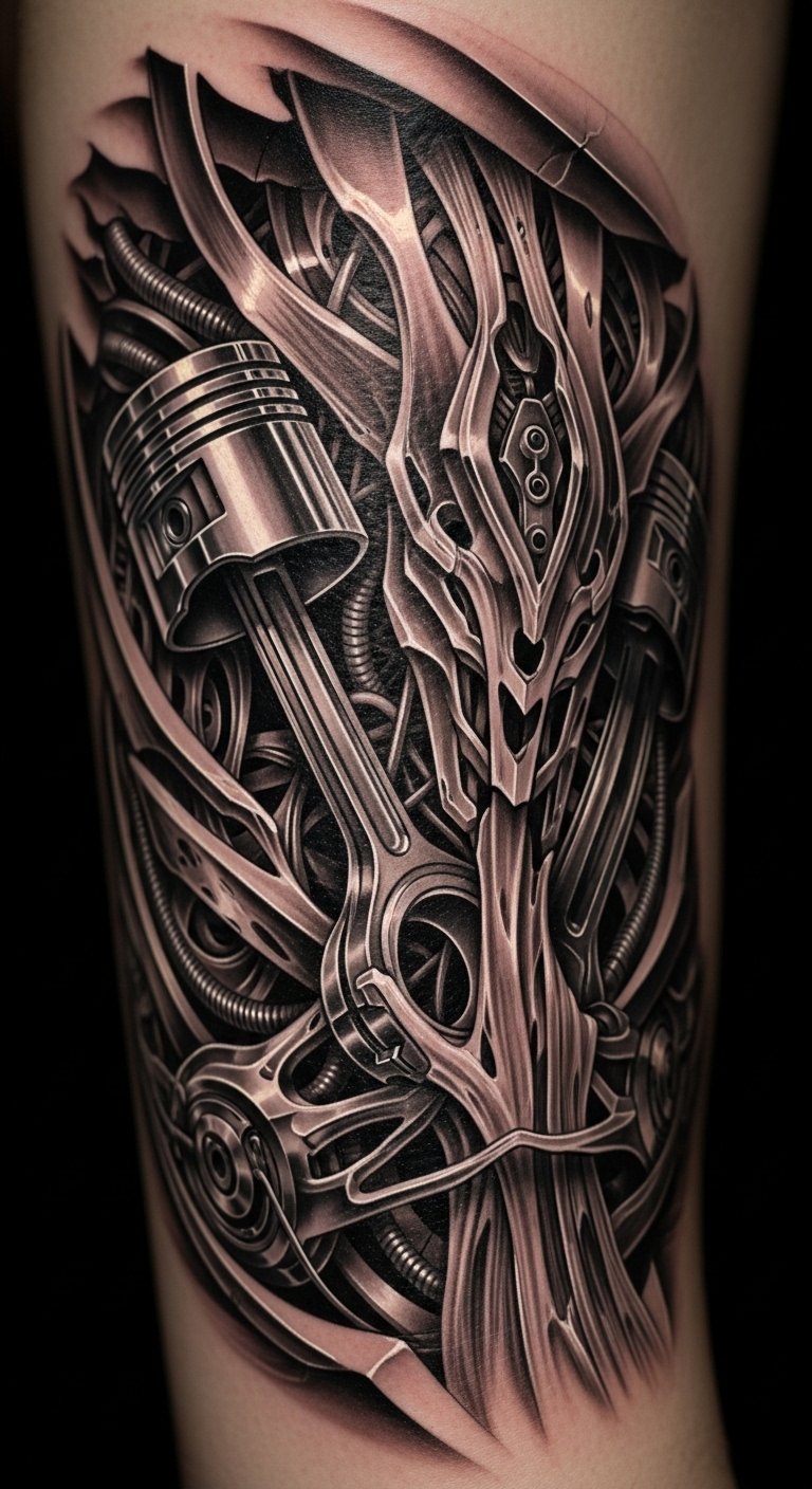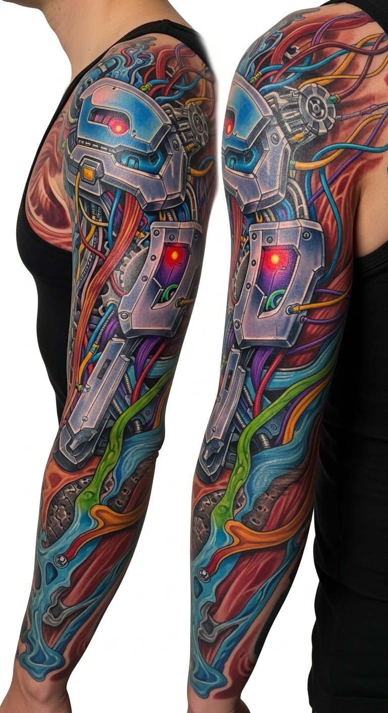This design symbolizes the coexistence of vulnerability and strength—organic tissues entwined with mechanical components illustrate healing through adaptation and the forging of identity from both pain and innovation. Emotionally it evokes resilience, curiosity, and a controlled fierceness; placement as a forearm sleeve allows visibility for personal affirmation and concealability when desired, following the musculature to enhance motion and the illusion of movement within the mechanics.