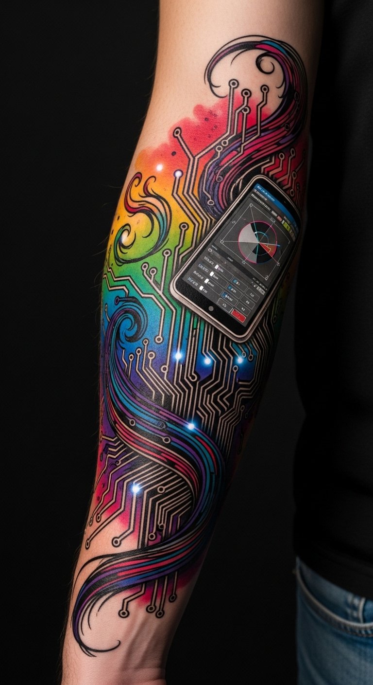 A biomechanical sleeve that merges circuit-like filigree, translucent holographic panels, and organic muscle-inspired shading—integrating miniature VR lenses and stylized avatar glyphs—designed to flow with the arm’s anatomy; symbolism: the circuitry and holographic elements represent the merging of digital identity and futuristic aesthetics, the VR lenses signify exploration and self-discovery, and the organic textures ground the piece in human experience; emotional tone: curious, assertive, and introspective, evoking empowerment through self-expression; placement: full arm sleeve (shoulder to wrist) with a focal cluster over the inner forearm for intimate viewing.