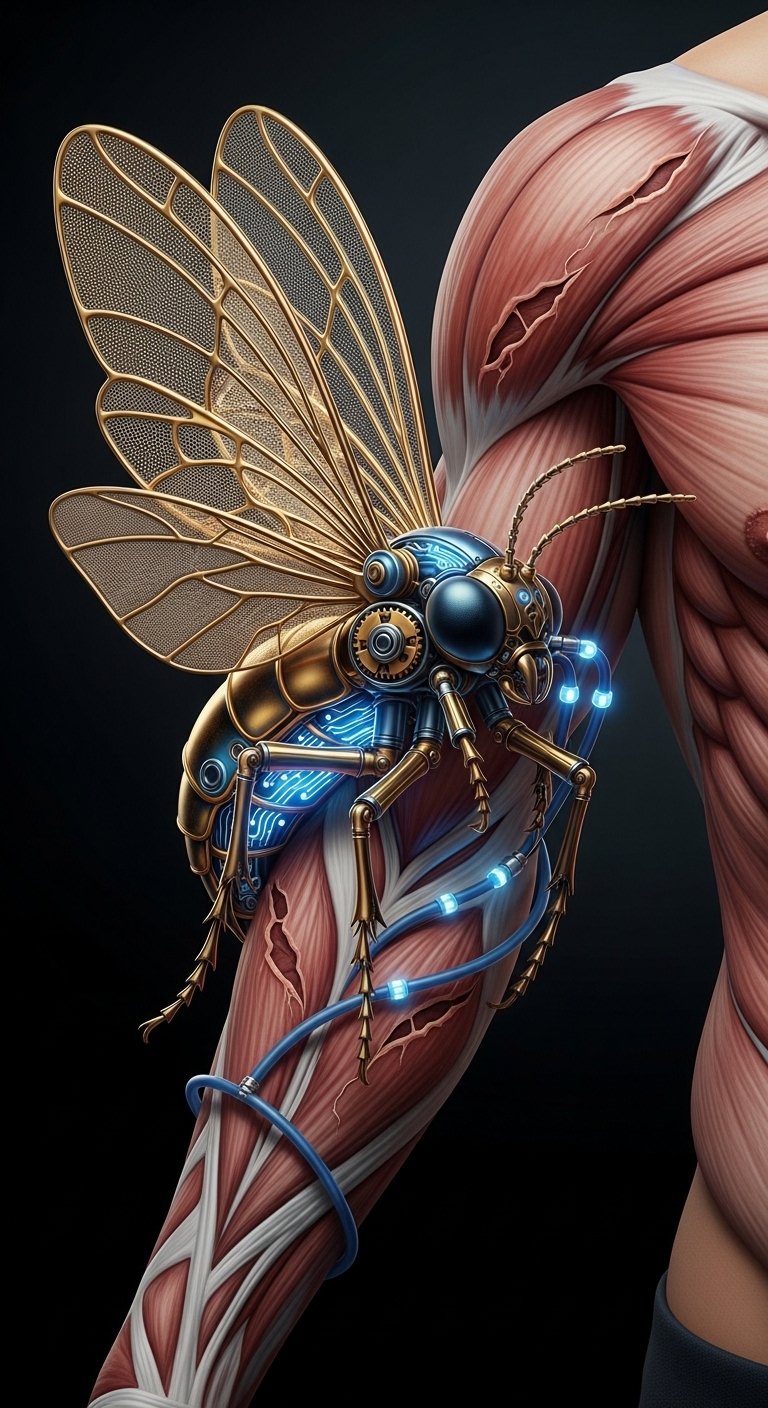 These designs evoke a sense of wonder, showcasing organic machinery entwined with human anatomy, inviting you to express your individuality and embrace the freedom of a unique, transformative style. The concept symbolizes the fusion of human vulnerability and engineered resilience—mechanical wings for aspiration, visible gears for inner complexity, and gentle blue illumination suggesting life within; emotionally it balances curiosity, empowerment, and metamorphosis.