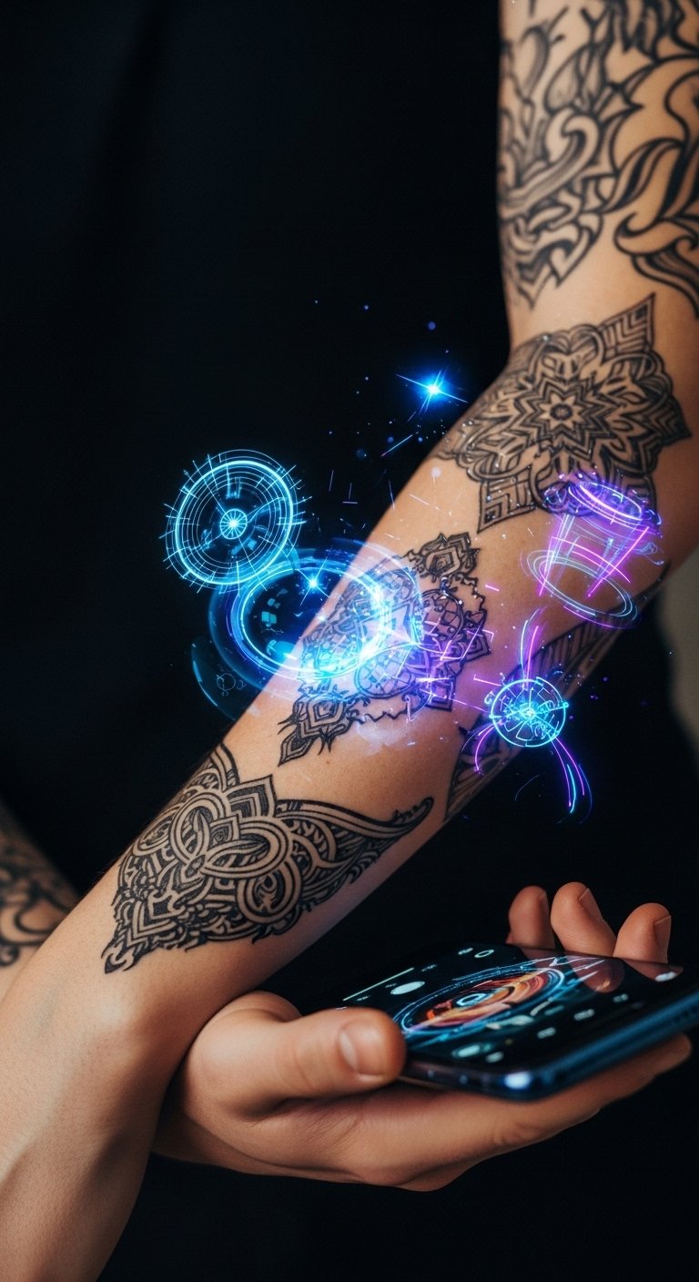 This design concept uses the original text as both inspiration and overlay: a flowing sleeve or backpiece that incorporates stylized circuitry, organic vines, and faint QR-like glyphs so AR triggers can anchor animations. Symbolically it juxtaposes permanence (ink) with changeable digital layers, expressing identity, memory, and connection; emotionally it evokes wonder and intimacy—tattoos that reveal private stories only when shared through a device. Ideal placements are forearm sleeve, full back, or chest where larger surfaces allow intricate linework and reliable AR tracking.