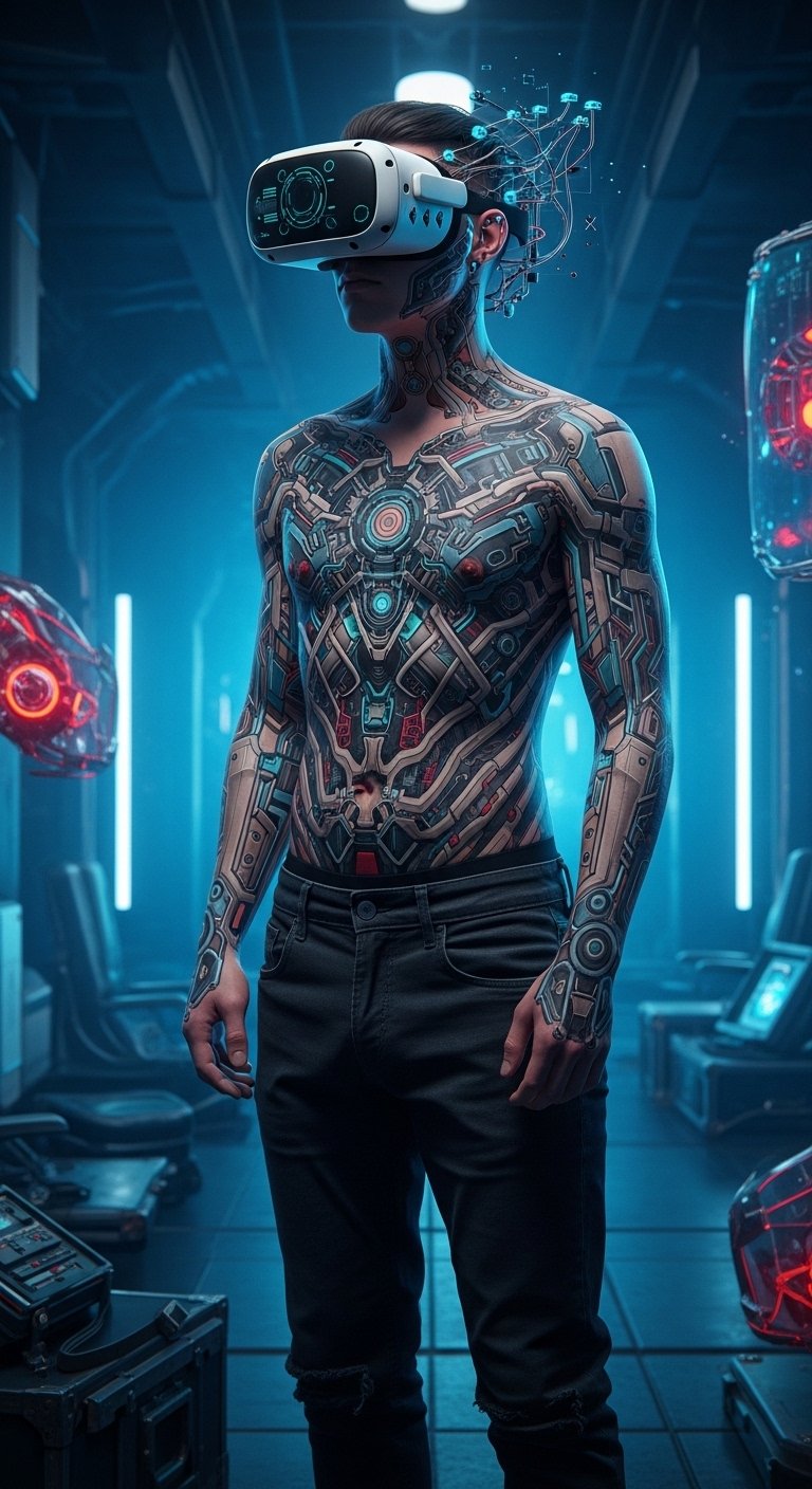 As technology advances, artists draw inspiration from these cultural phenomena, creating stunning designs that blur the line between human and machine. This design symbolizes the fusion of identity and technology—mechanical components represent resilience and precision, LEDs and HUD motifs suggest awareness and connectivity, while torn skin edges evoke vulnerability and transformation.