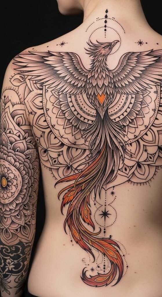 A sleeve or back tattoo combining a rising phoenix with concentric mandala layers radiating outward, fine line details, dotwork shading, subtle color accents (fiery oranges, deep indigos, gold highlights), negative-space glyphs for stars and pathways; design flows with body contours, phoenix centered on shoulder blade or sternum, mandalas expanding across chest, ribs, or upper arm. This concept symbolizes rebirth and unity, evoking resilience, spiritual awakening, and cosmic belonging; placement choices allow for intimate or bold display, and the interplay of sharp phoenix lines with soft mandala geometry creates emotional contrast—strength meeting contemplative harmony.